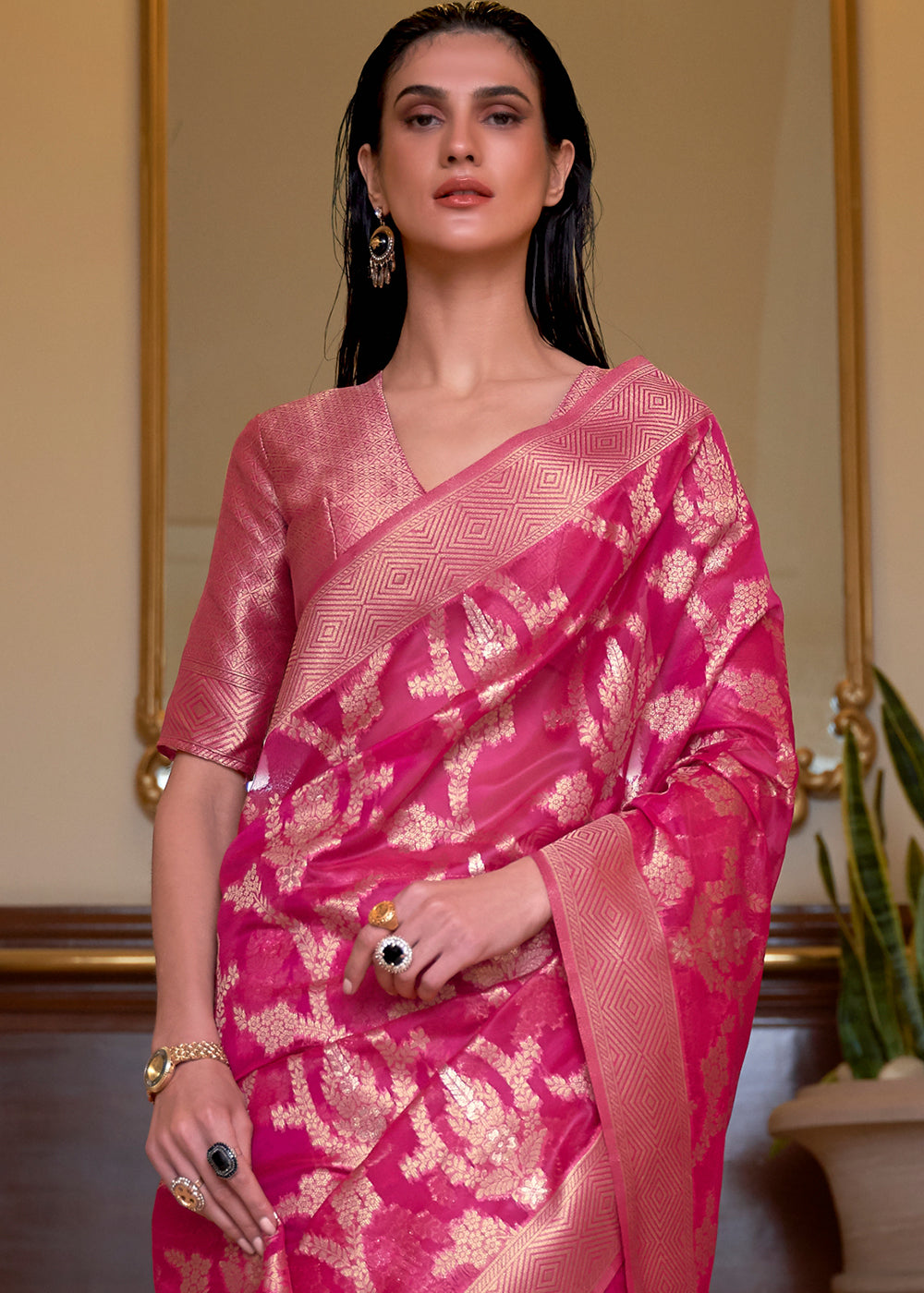Hot Pink Two Tone Handloom Woven Organza Silk Saree