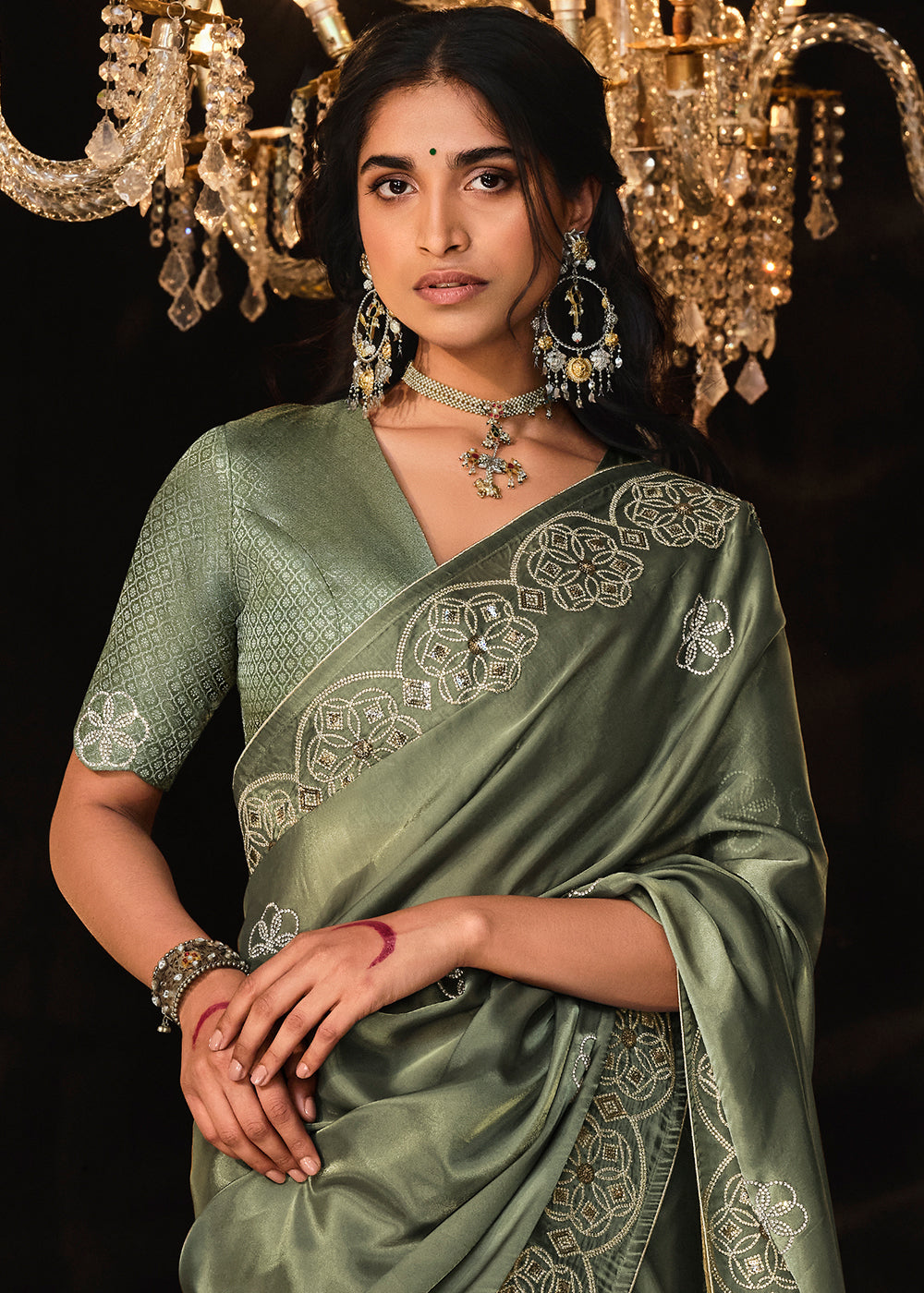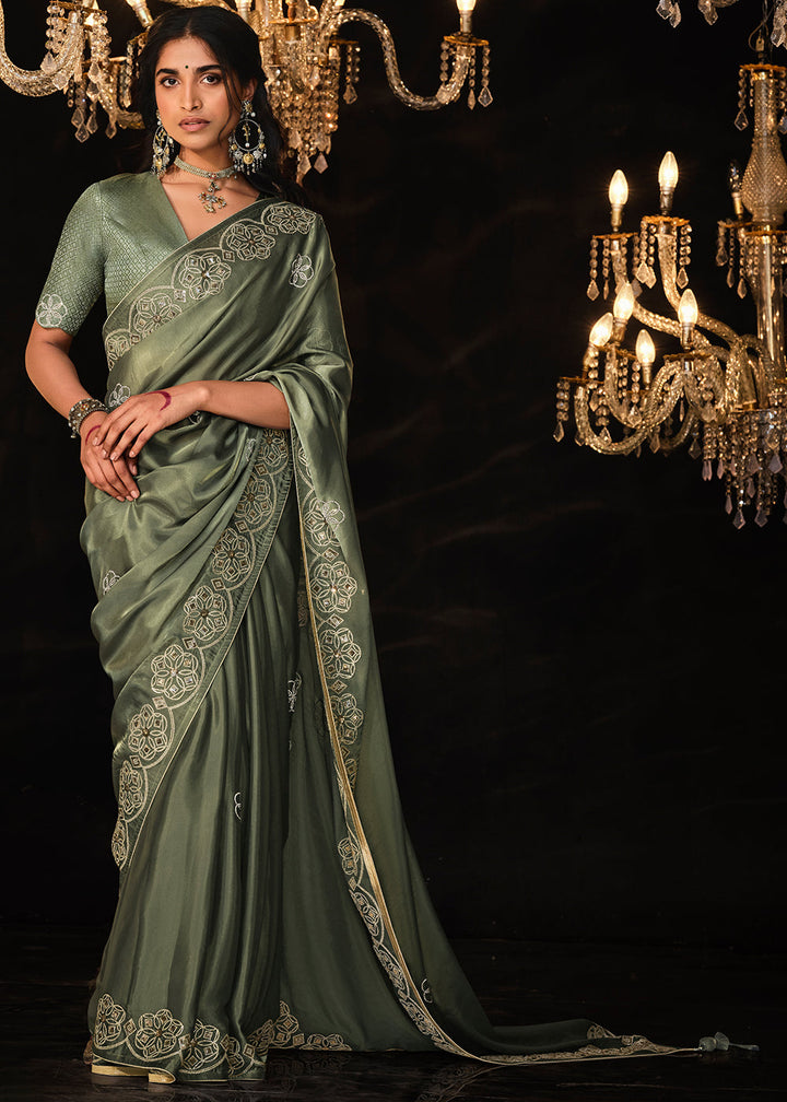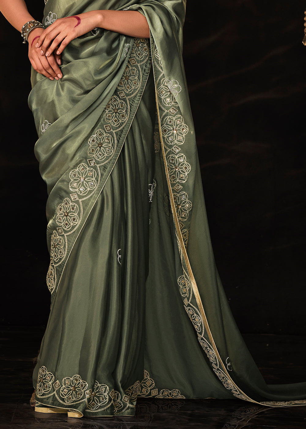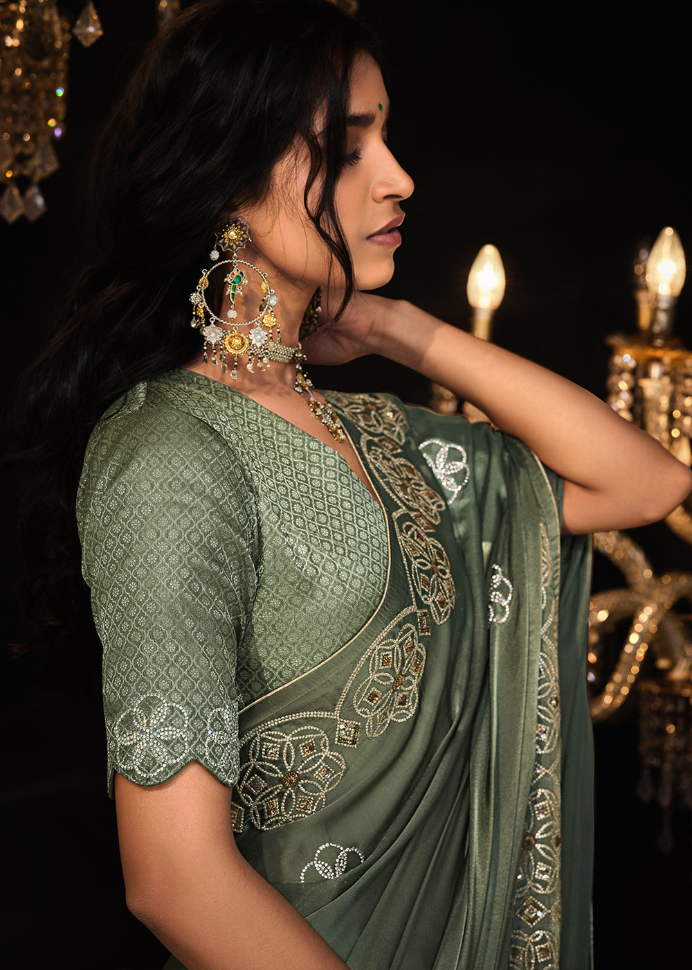 Hunter Green Satin Silk Saree Embellished with Stone,Sequin,Embroidery & Zarkan work