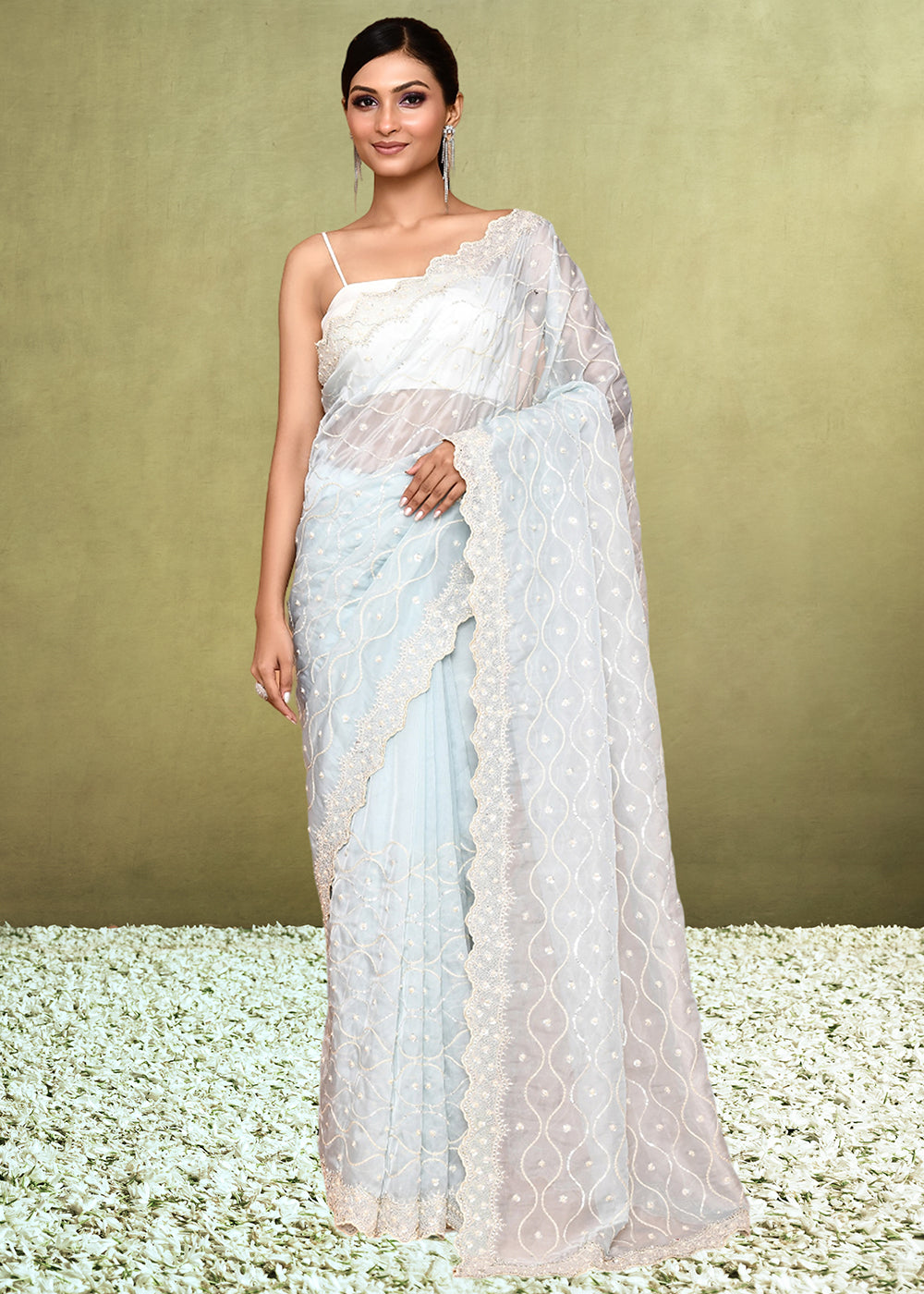 Ice Blue Organza Satin Silk Saree having Sequence with Diamond work