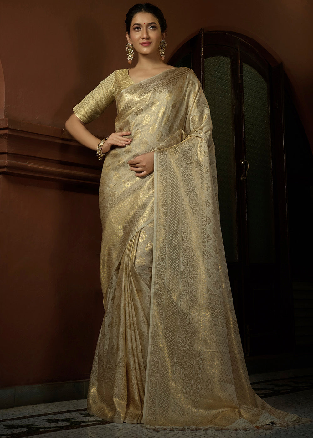 Ivory White & Golden Blend Woven Kanjivaram Silk Saree(Pre-Order)