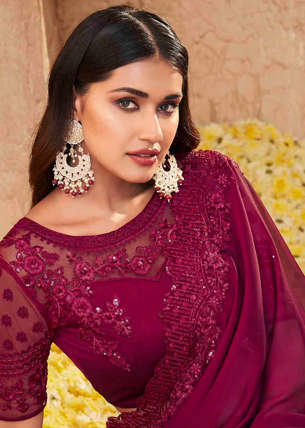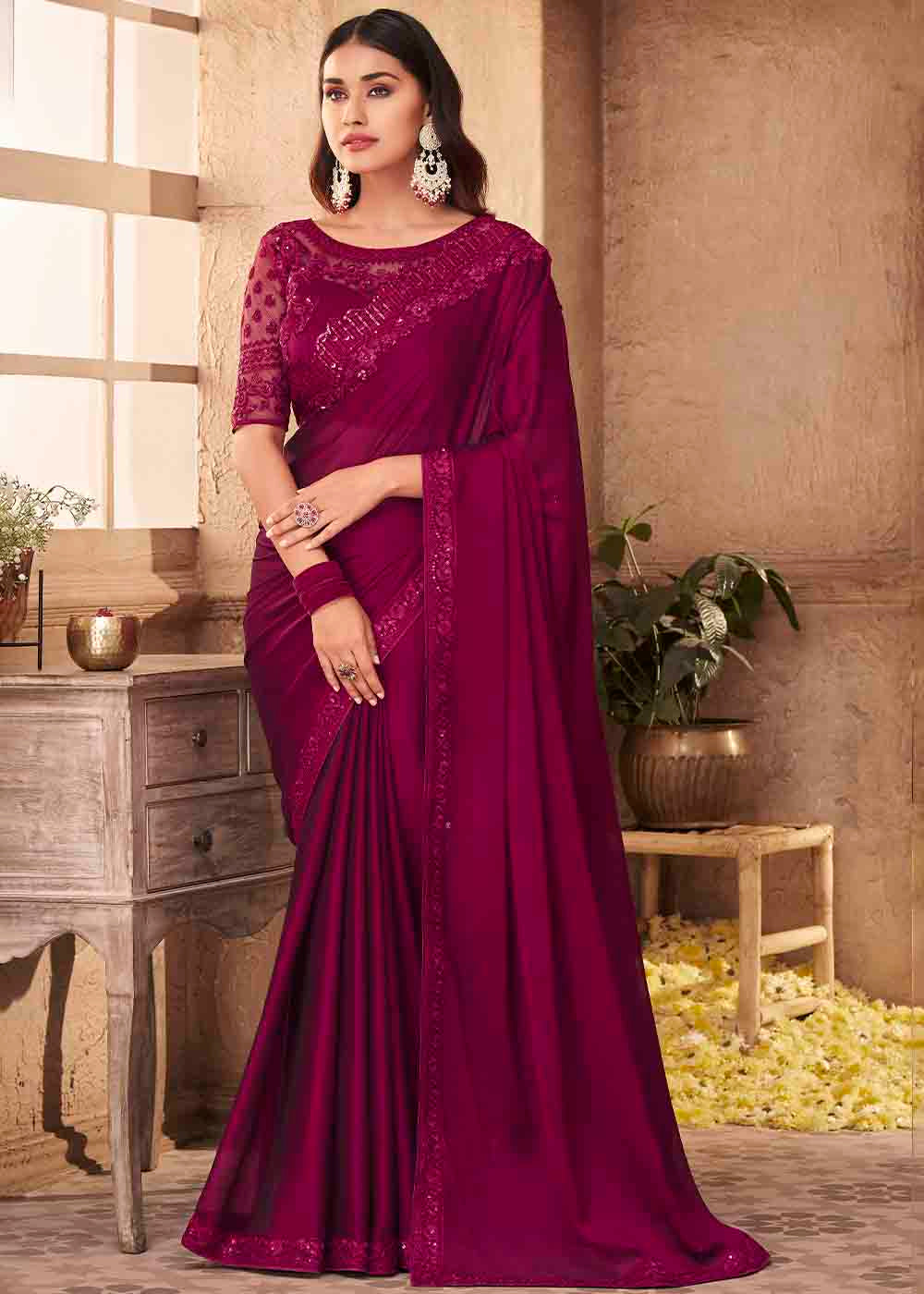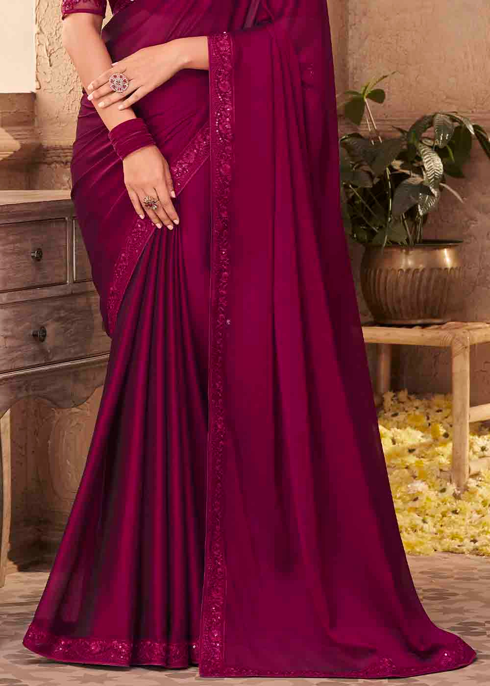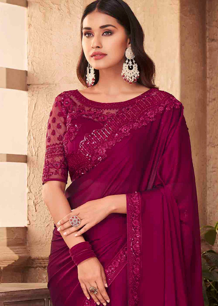 Jam Purple Designer Embroidered Satin Silk Saree with Sequence work