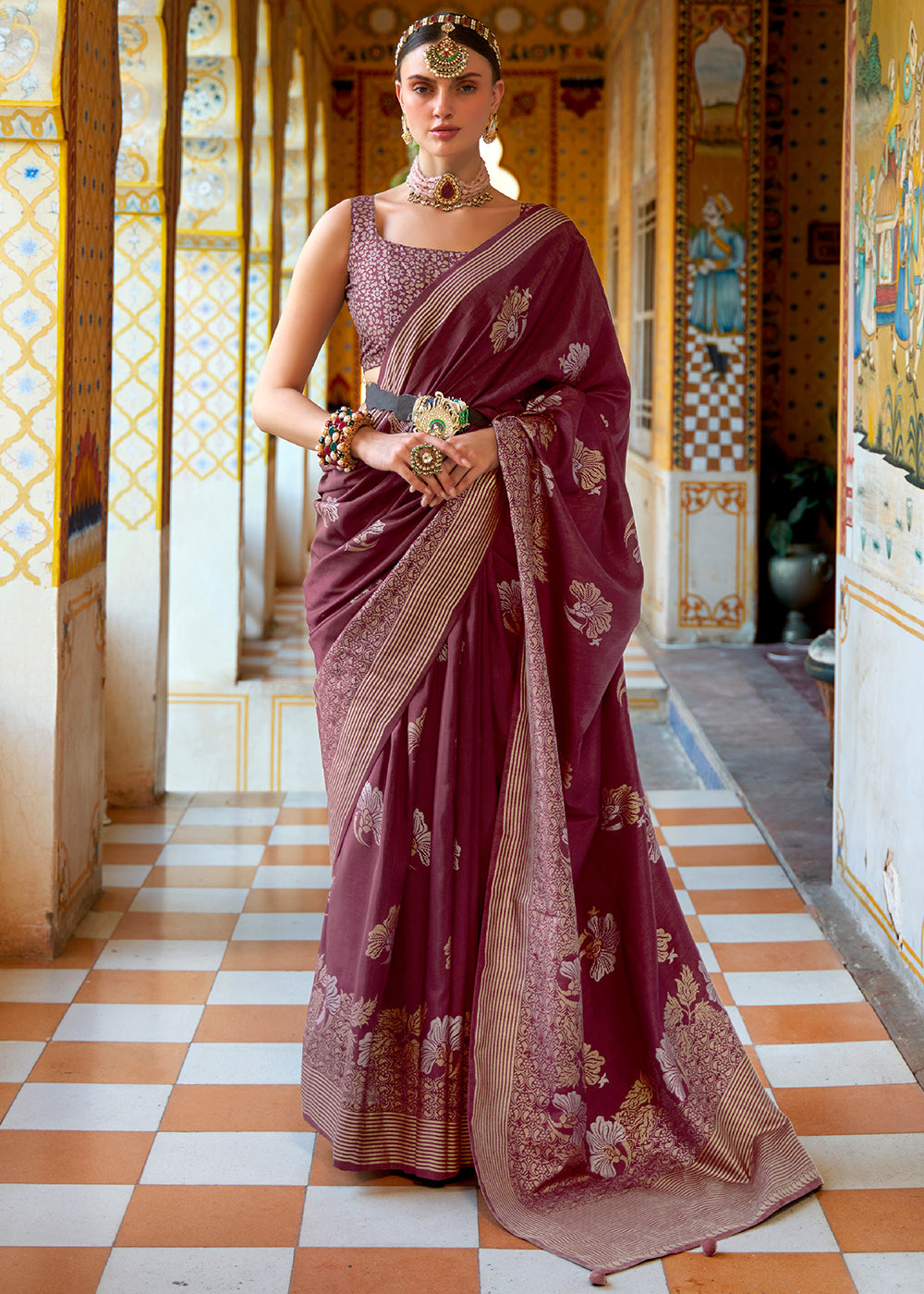 Banarasi silk sarees are perfect picks to evoke timeless charm and celebrate traditional treasures. This zari-woven saree in the hues of Jam Purple is here to give you the warmth of one of the finest silks from Banaras, India. Embellished with a gleaming border and overall design, this will add a new, fresh flavour to your ethnic wardrobe.