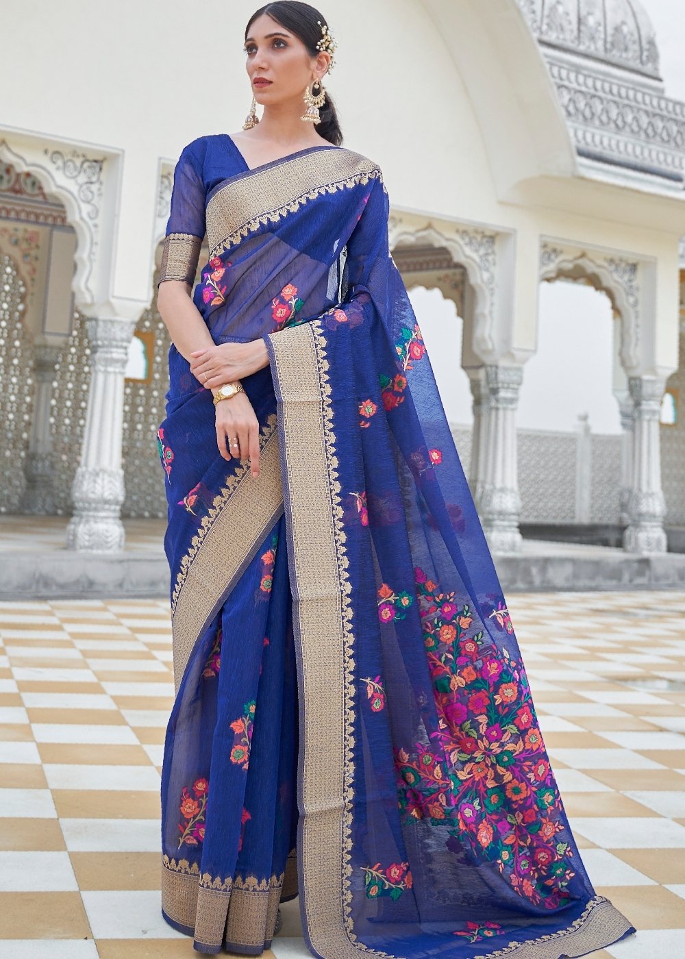 Lapis Blue Floral Embroidered Linen Silk Saree