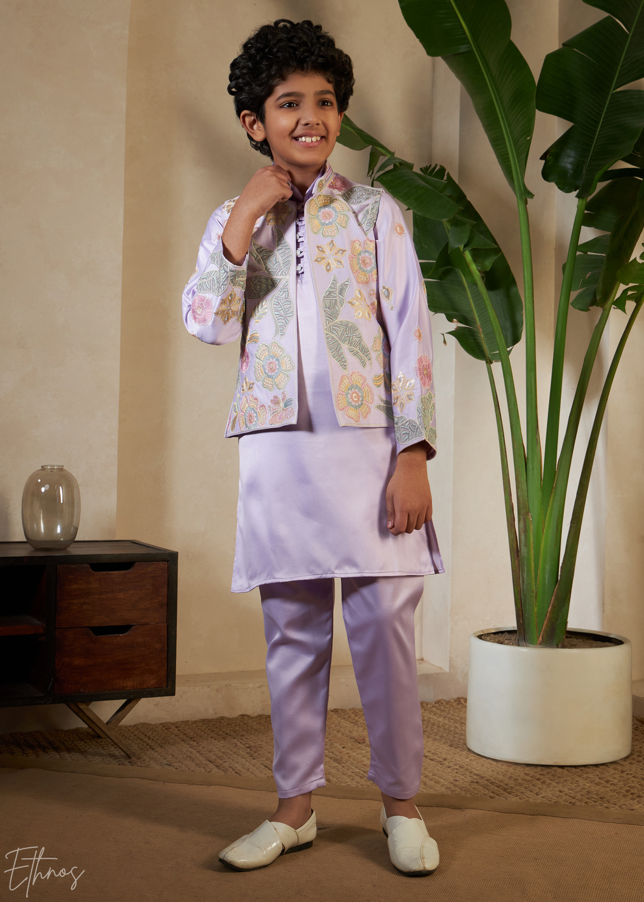 Opt for contemporary charm with this sophisticated lavender purple ethnic set. The soft, breathable satin kurta and pajama is matched by a chic jacket, detailed with elegant embroidery to create a standout look. This unique and fashionable three-piece ensemble is guaranteed to make a statement at any special event, offering a blend of traditional roots and trendy appeal.