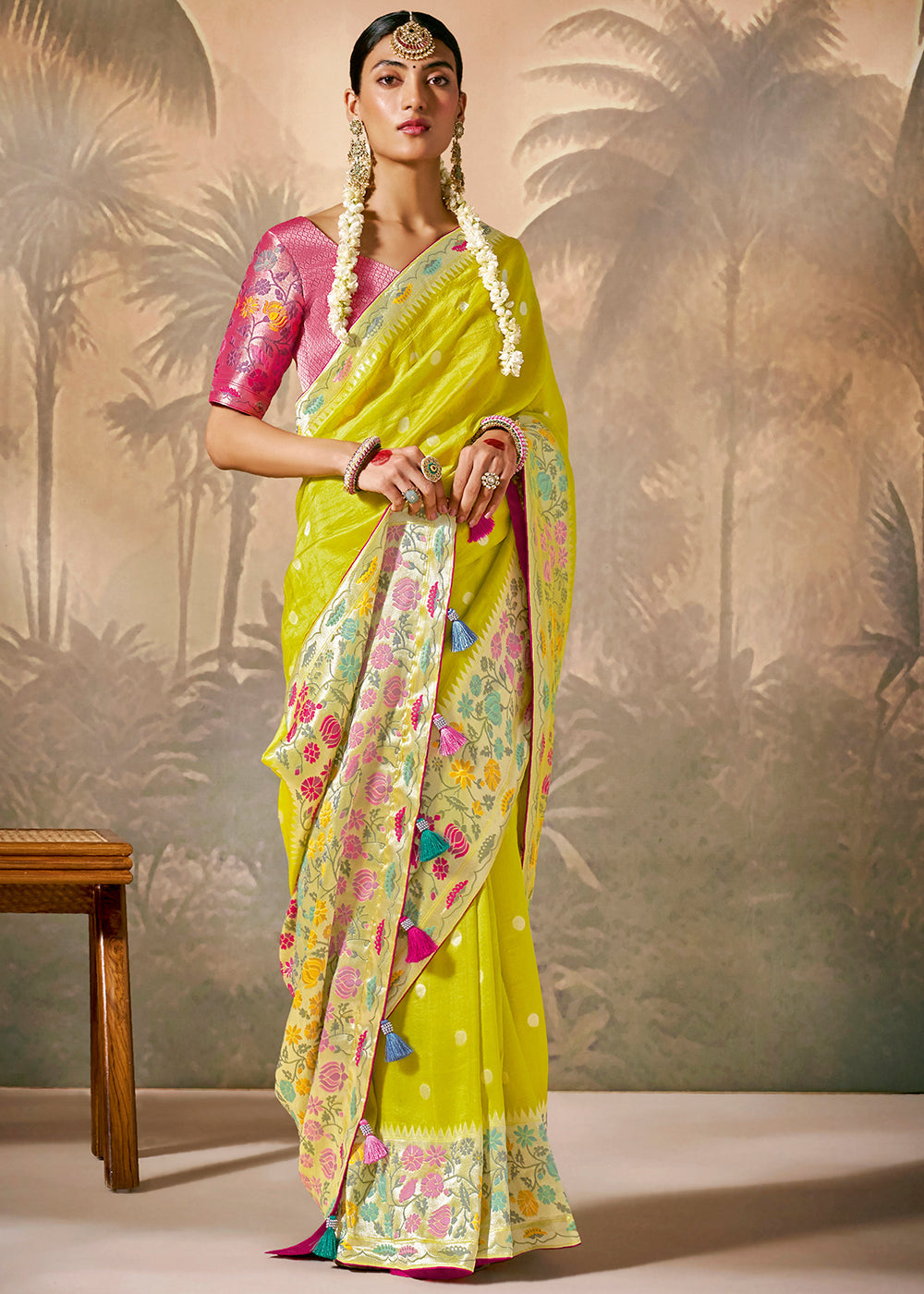 Lemon Yellow Munga Silk Saree with Zari work & Woven with Resham in Floral Motifs
