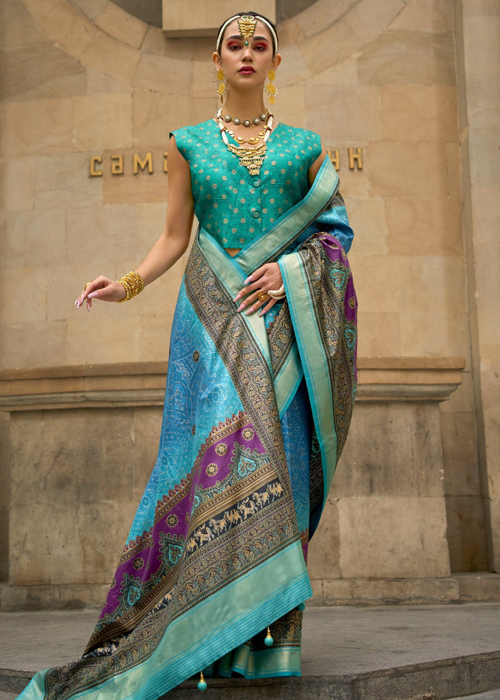 Light Blue Poly Viscose Silk Saree With Foil Print