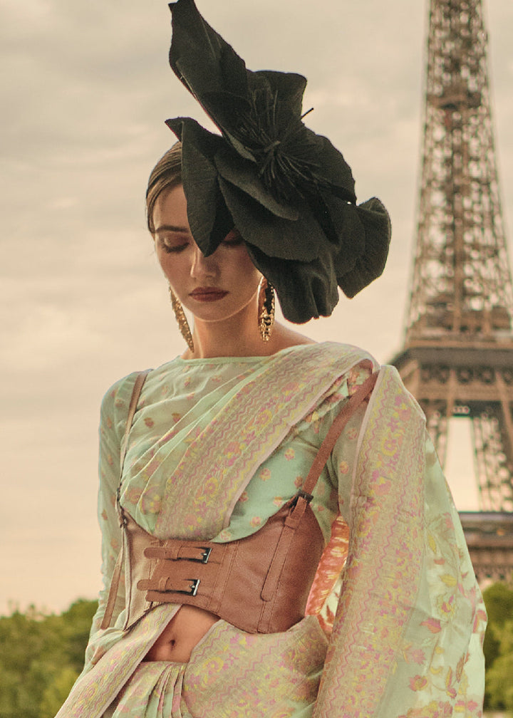 Light Green Woven Kashmiri Organza Silk Saree, a stunning piece that merges heritage craftsmanship with contemporary charm. The exquisite woven Kashmiri patterns reflect the artistry of traditional weaving techniques. This saree is ideal for the modern woman who seeks to balance elegance with effortless style.The lightweight organza silk ensures a graceful drape, giving you a flattering silhouette that’s perfect for weddings, festive occasions, or formal events. The intricate detailing adds a regal touch, making this saree a showstopper. Pair it with a fitted blouse and minimalistic jewelry for a refined look.