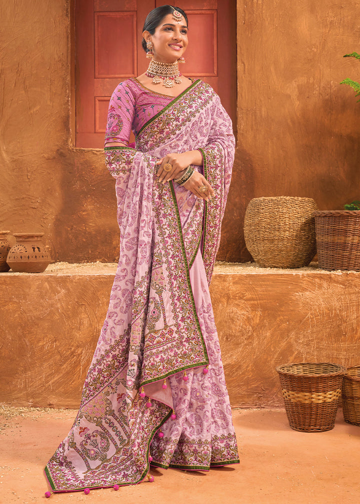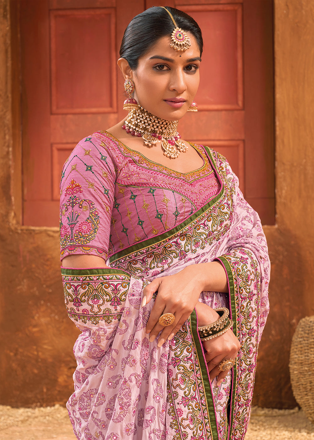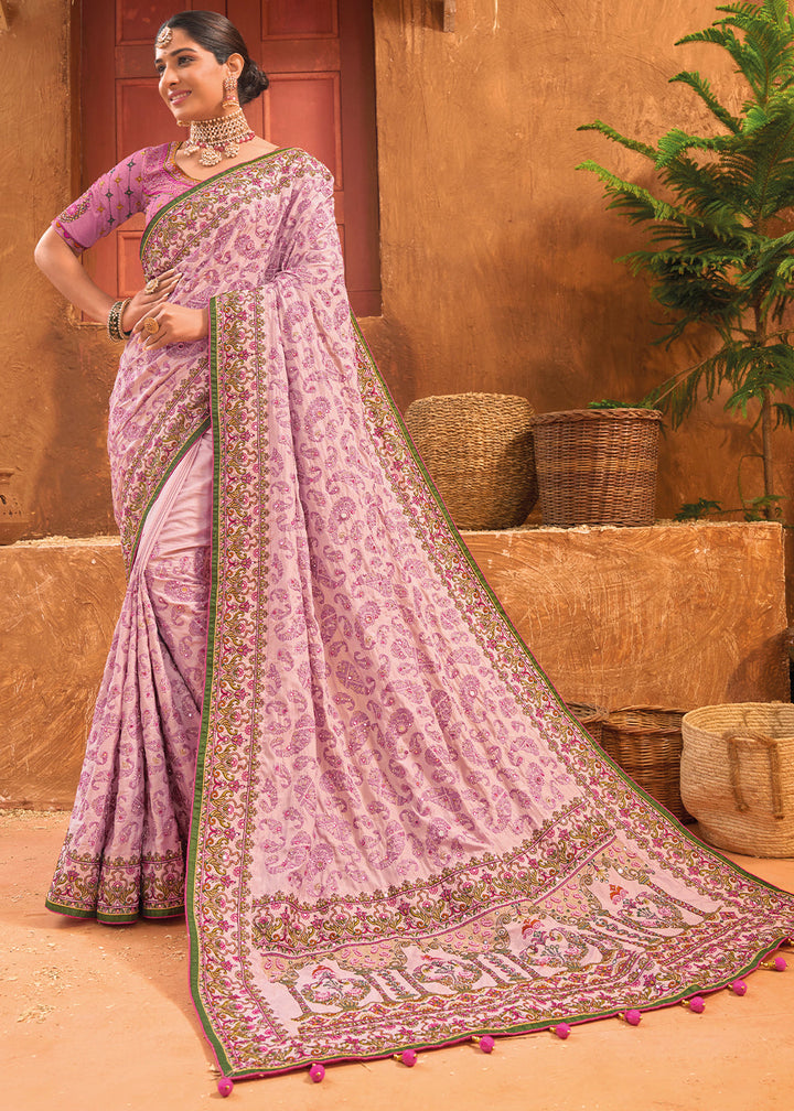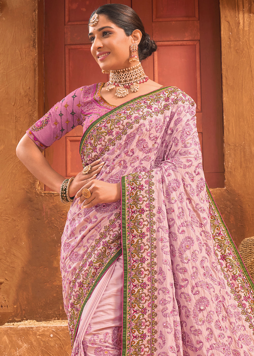 Light Lilac Purple Banarasi Silk Saree with Diamond,Mirror & Kachhi work