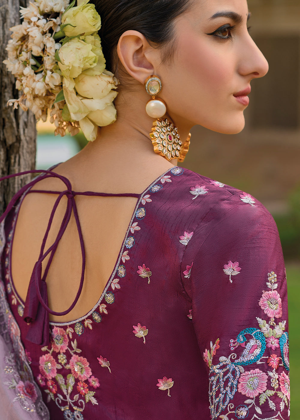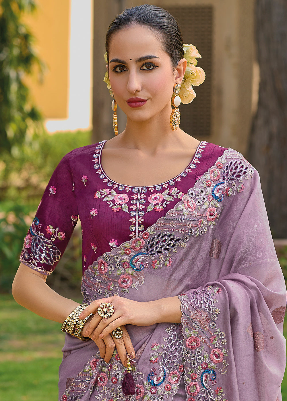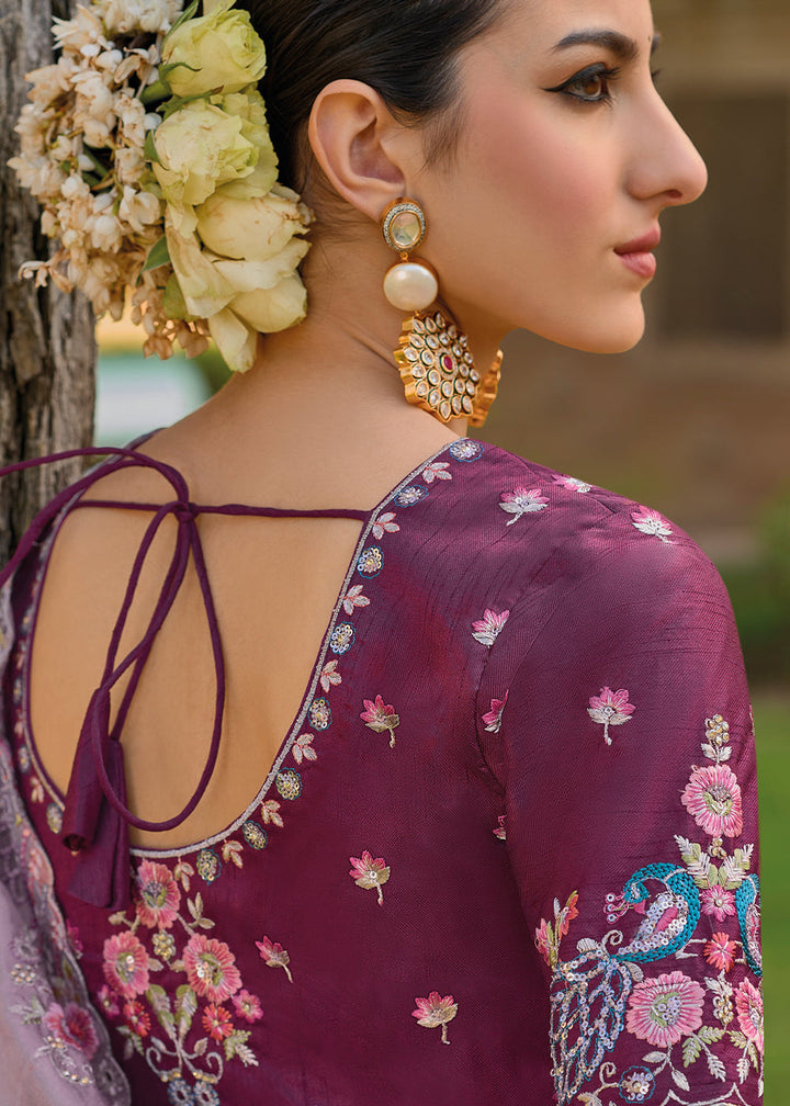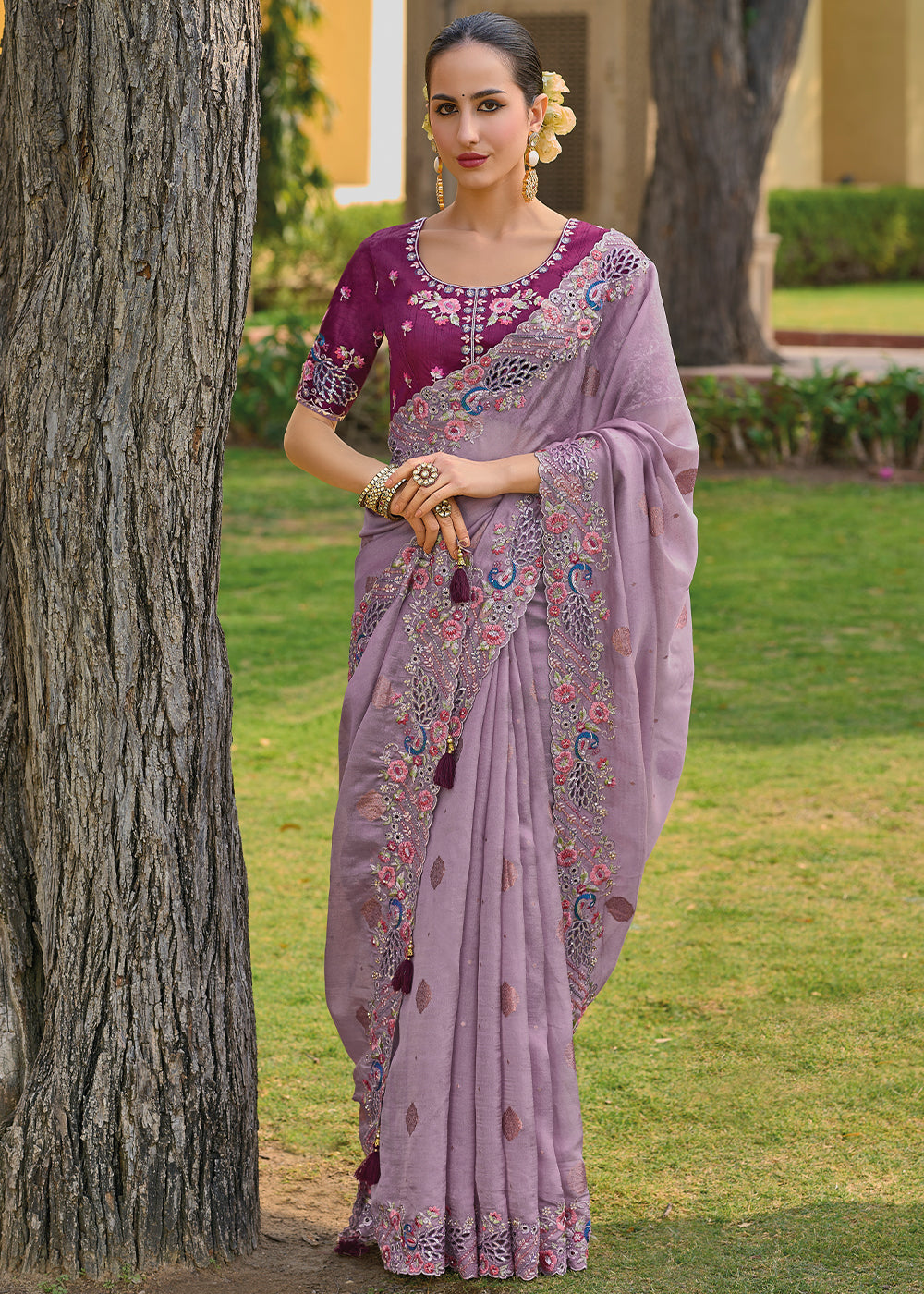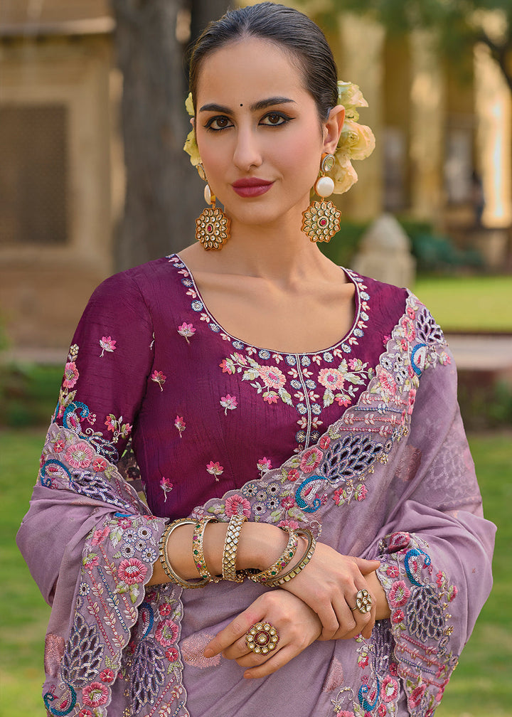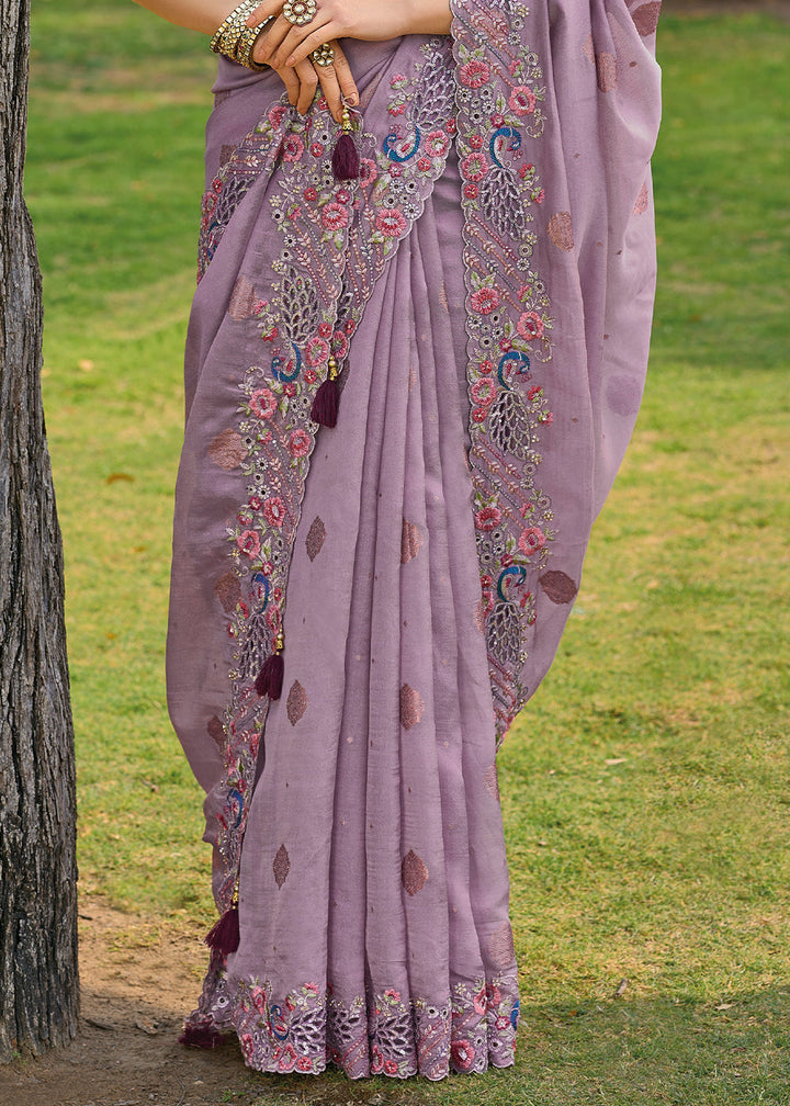 Light Lilac Purple Tissue Organza Silk with Embroidery Cut Work Border, Stone & Sequence work