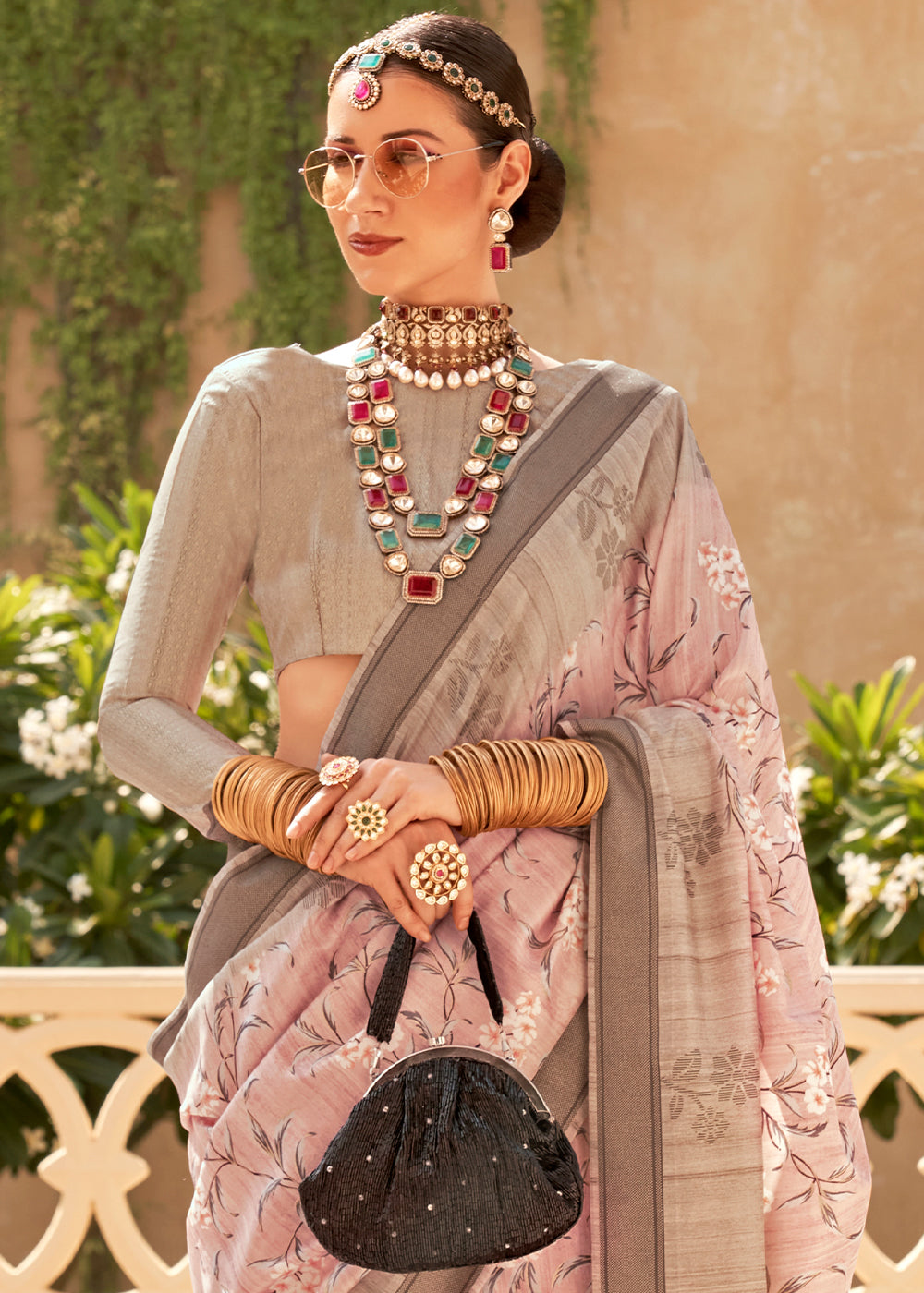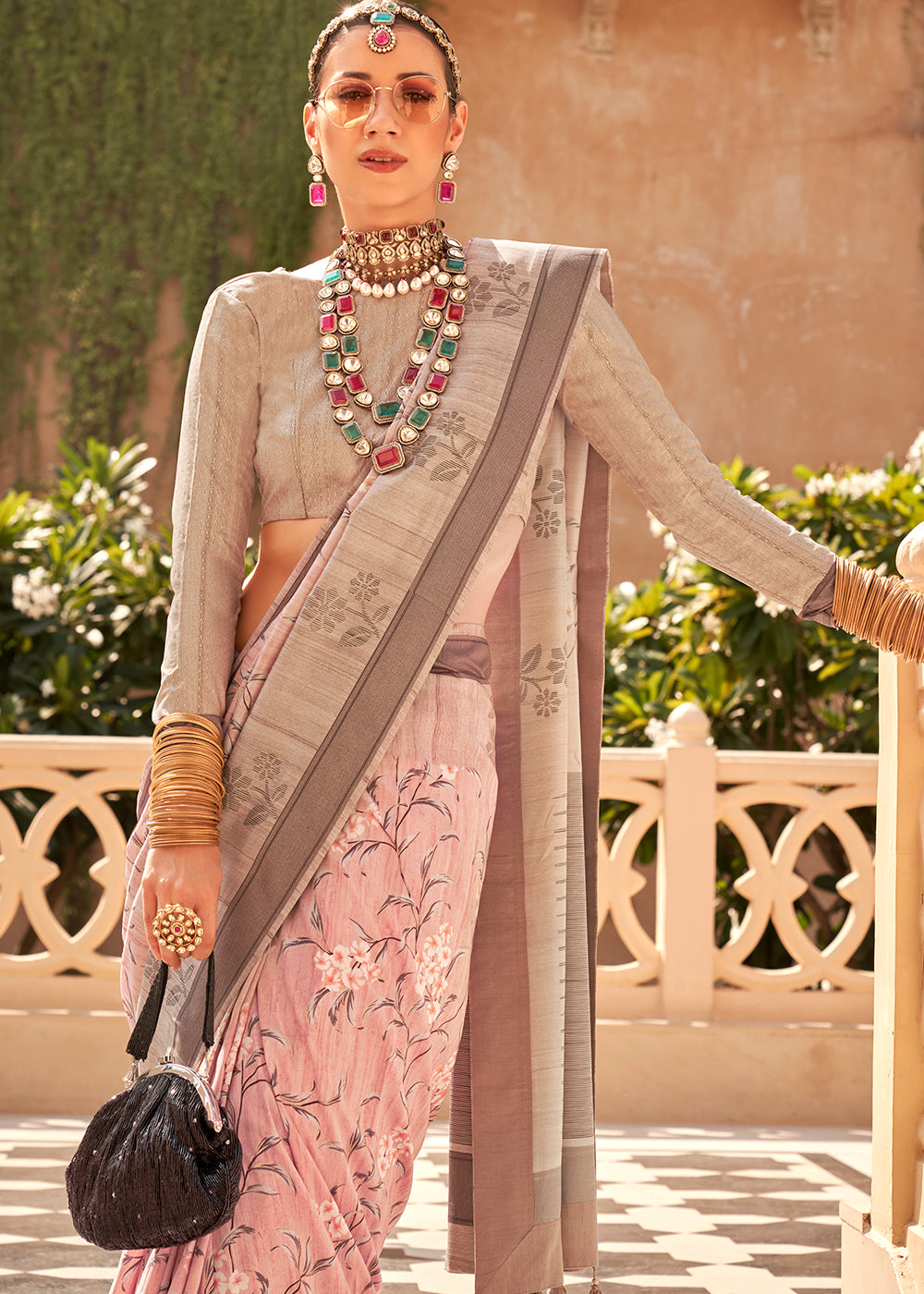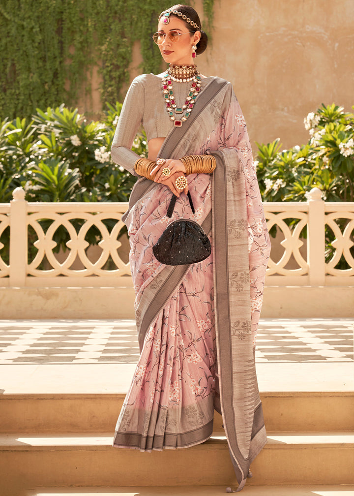 Light Peach Pink Khadi Printed Raw Silk Saree