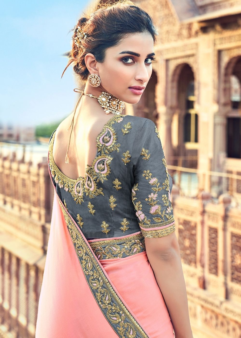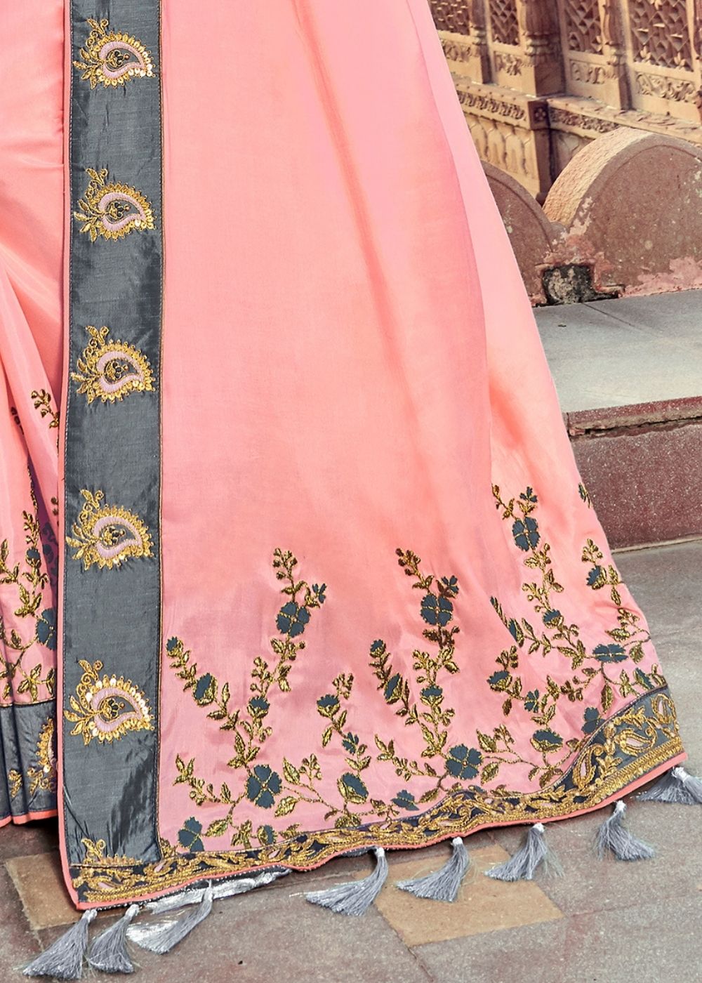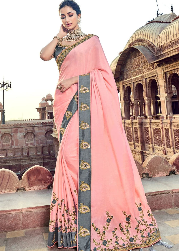 Silk sarees are a beautiful amalgamation of India's culture and tradition. Choose our carefully curated collection and feel the warmth of our embroidered silk sarees. A grey border on the pink ensemble with a grey blouse, this speaks tales of the intricate work and craftsmanship involved.