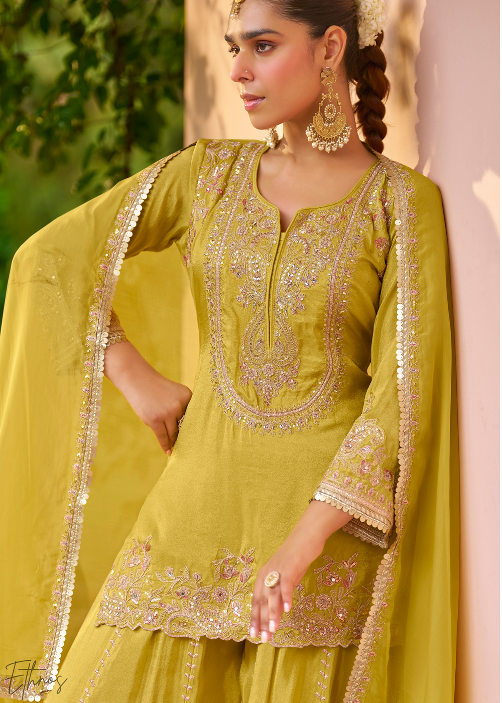 Lime Yellow Embroidered Chinon Sharara Suit