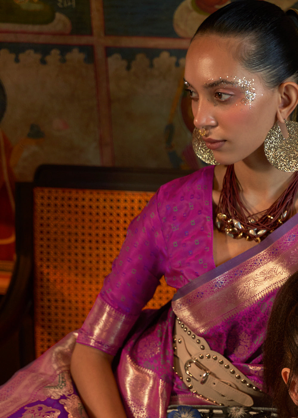 Gracefully manifesting the style with its rich aura, here's this perfect festive weave! A contemporary drape delighted in vibrant tones of Lollipop Purple, this Tanchoi Handloom Woven Satin Silk Saree is a sublime beauty that's bound to turn heads. Offering a luxurious feel with its texture, this piece is a wardrobe essential.