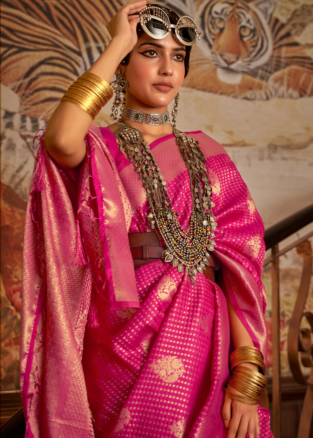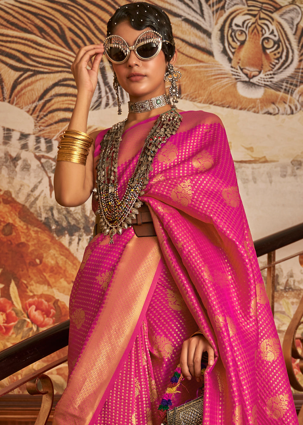 A mandatory part of the bridal trousseau in North India, Banarasi silk sarees impart an opulent look to your ensemble. This vibrant Magenta Pink saree is here to give you the perfect look for that festive get-together you have planned. Team this up with some antique jewellery and be an ethnic sensation.