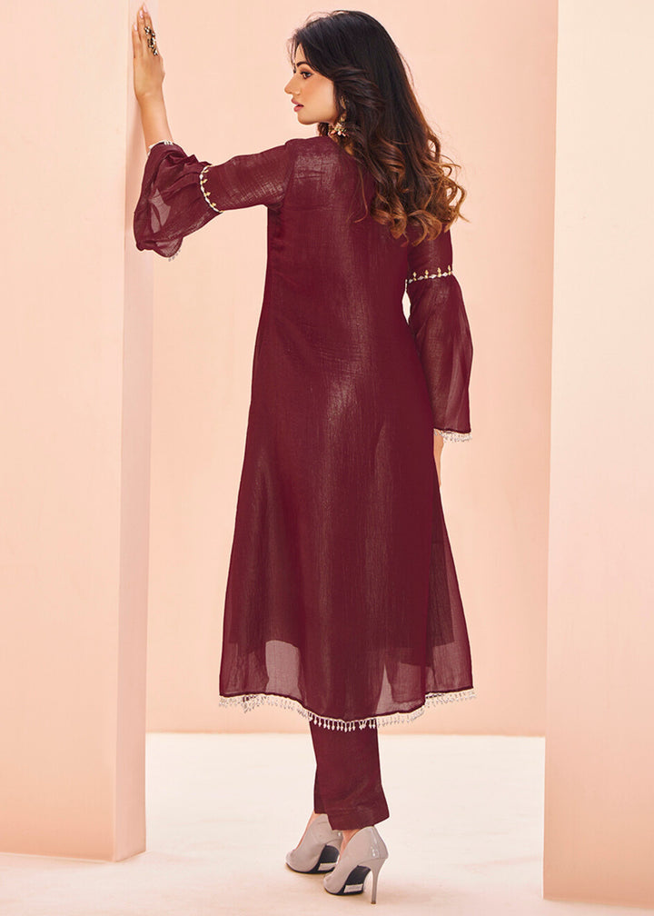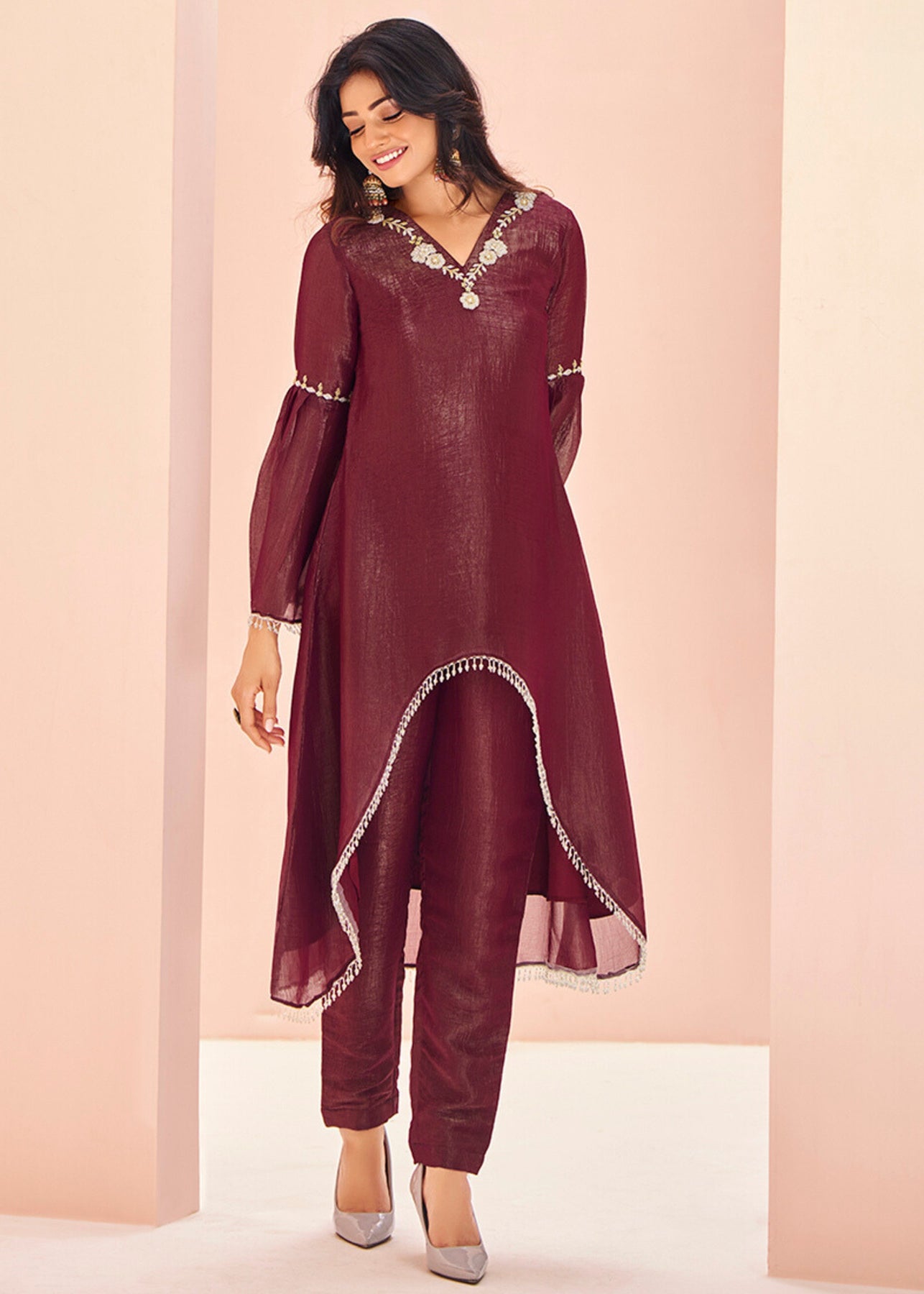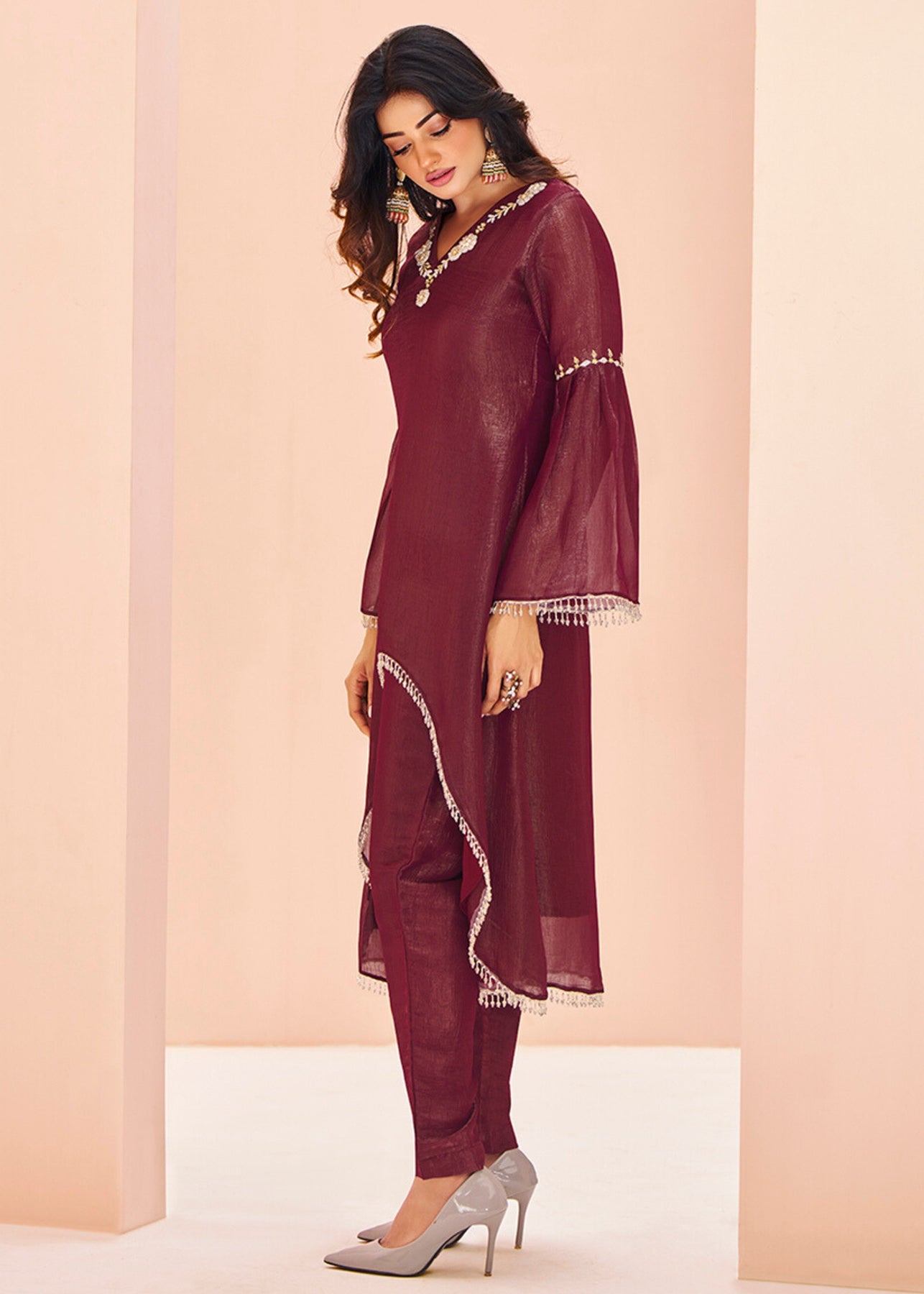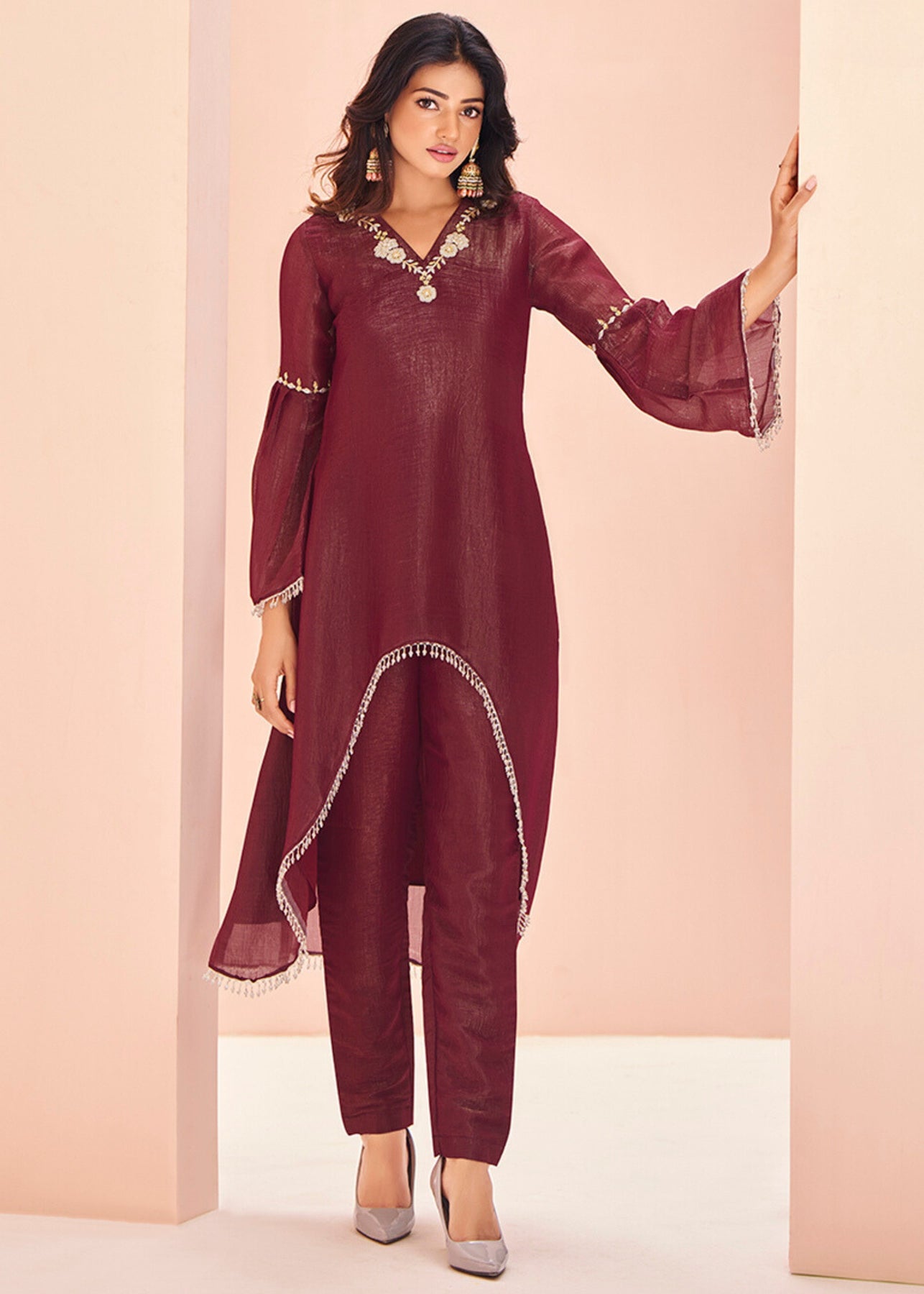 This is an elegant maroon kurta set with a high-low hemline. The kurta is embellished with intricate golden embroidery along the neckline and sleeve details, adding a touch of sophistication. The flared bell sleeves, trimmed with delicate lace, enhance the overall design's gracefulness. Paired with matching straight-fit pants, the outfit exudes a modern yet traditional charm, perfect for festive or semi-formal occasions.