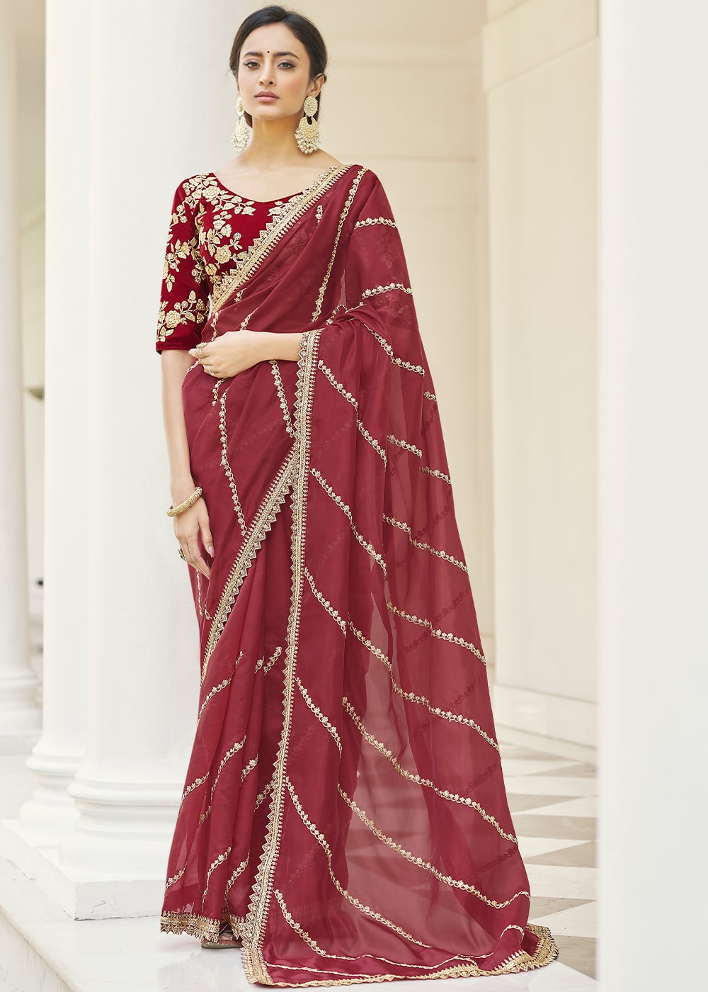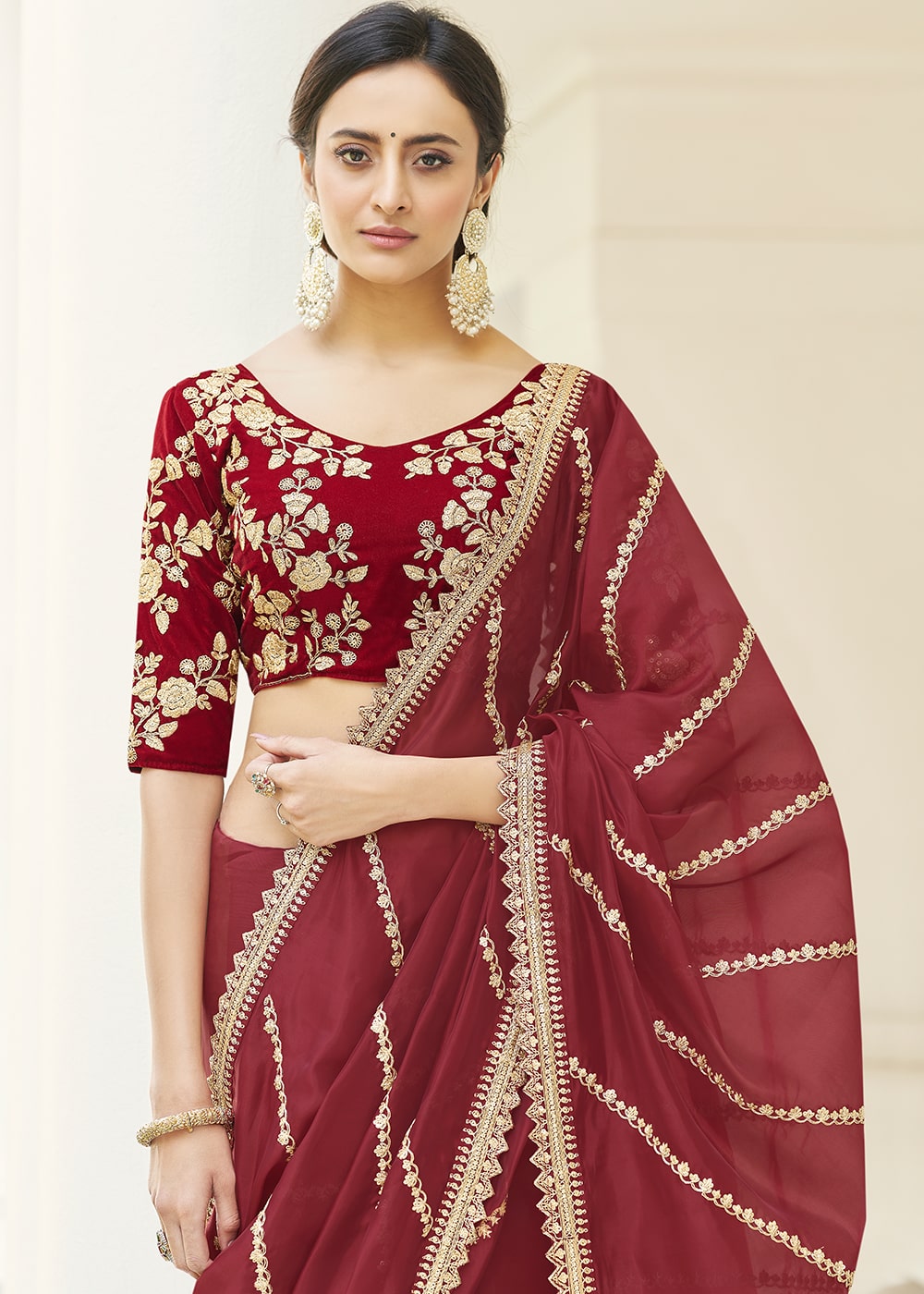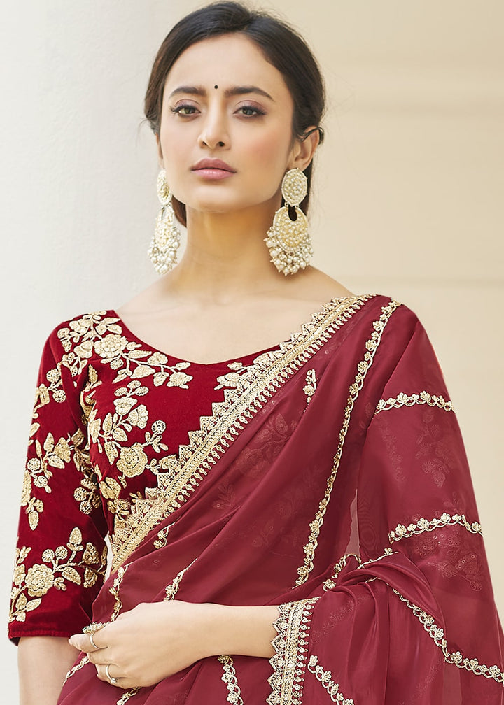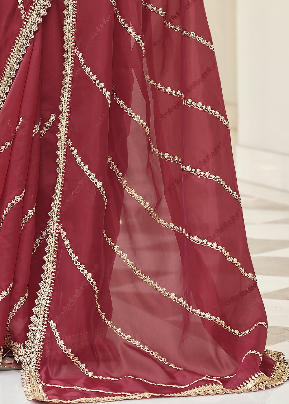 Maroon Red Designer Organza Saree with Dori & Sequins work