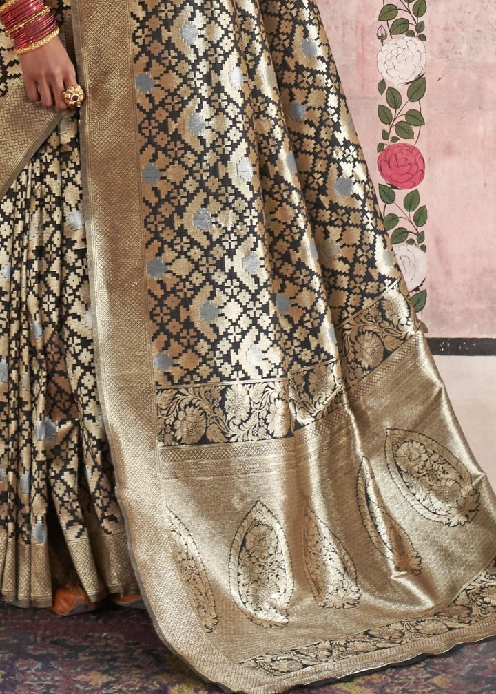 Midnight Black Handloom Weaving Silk Saree with Golden Border