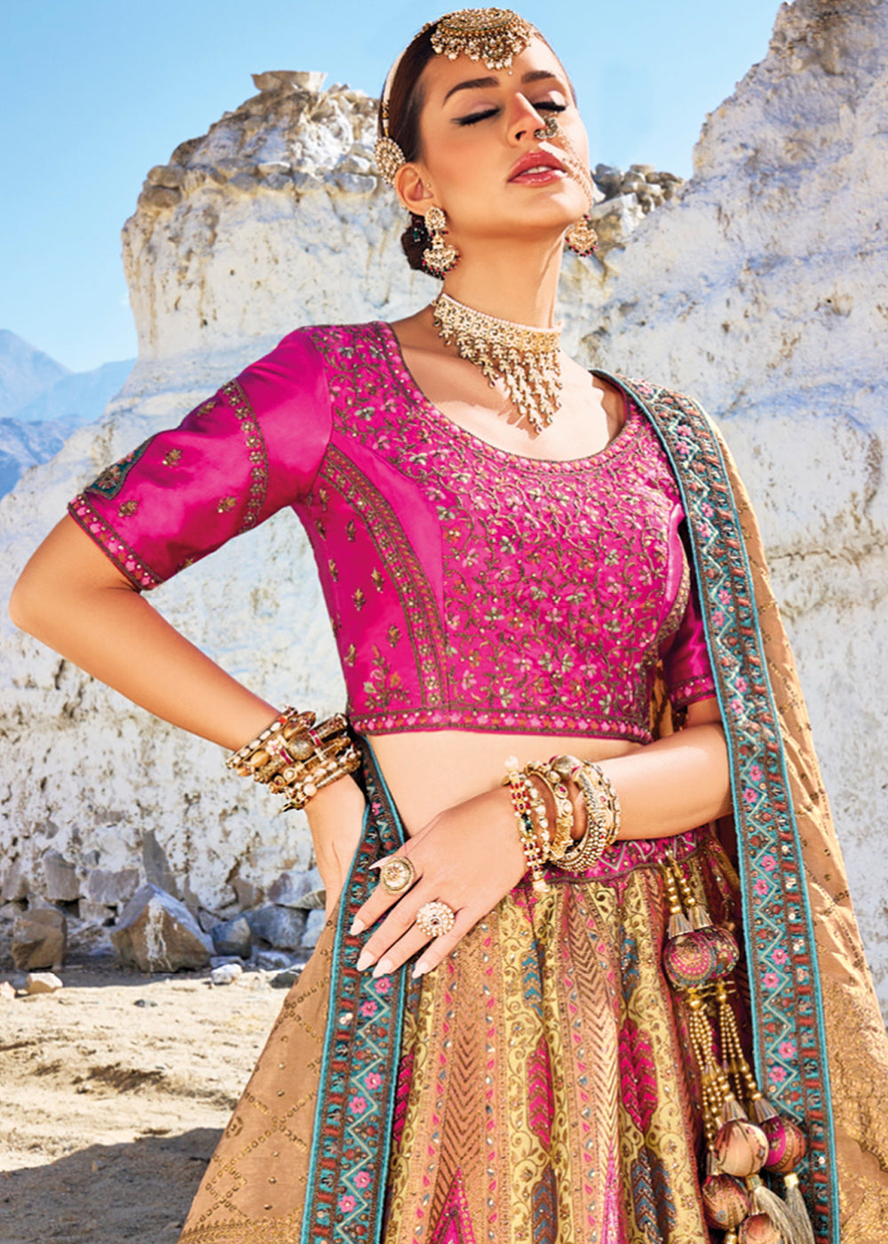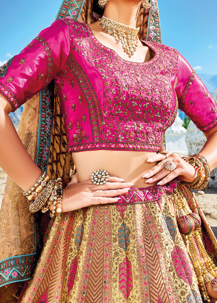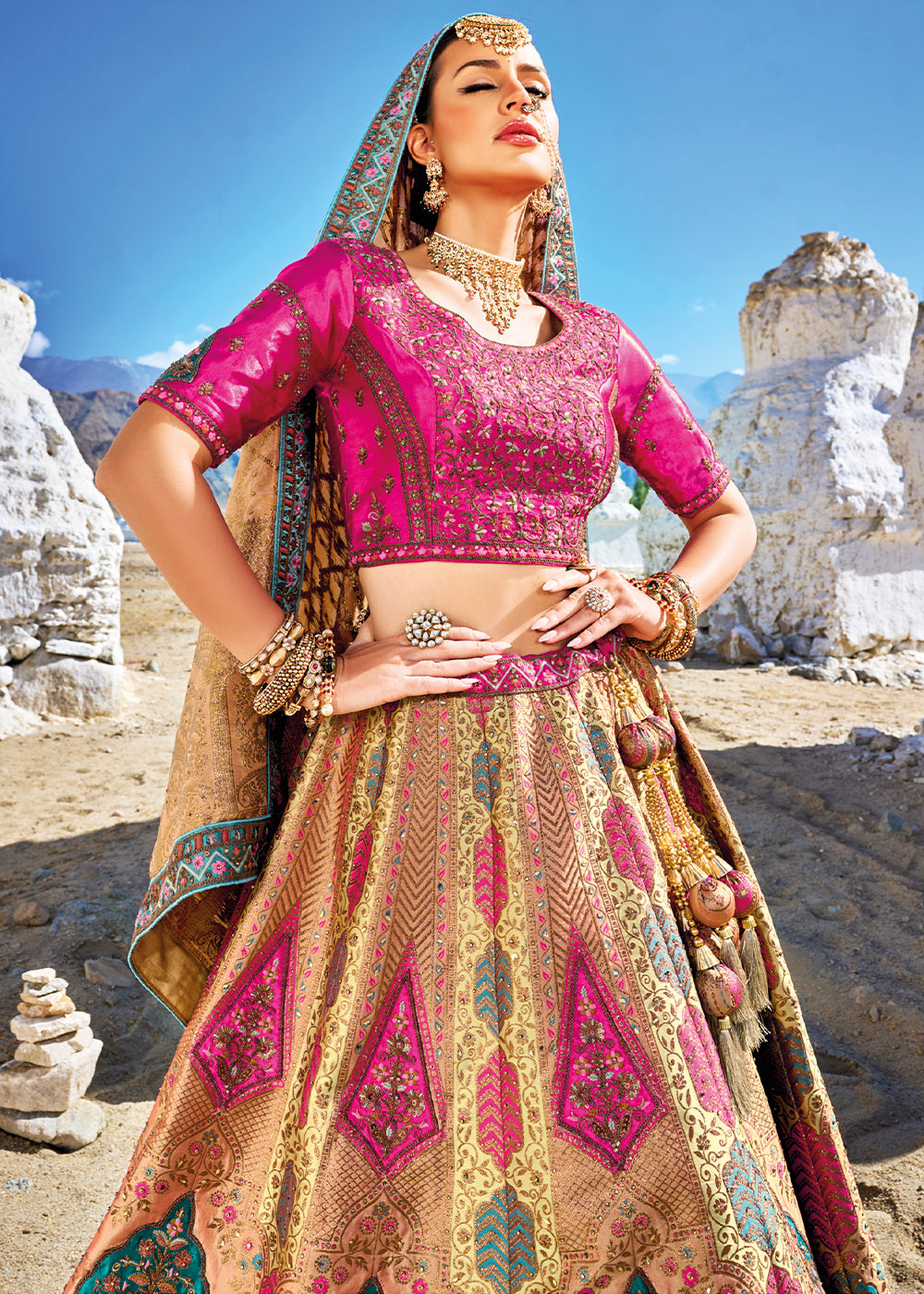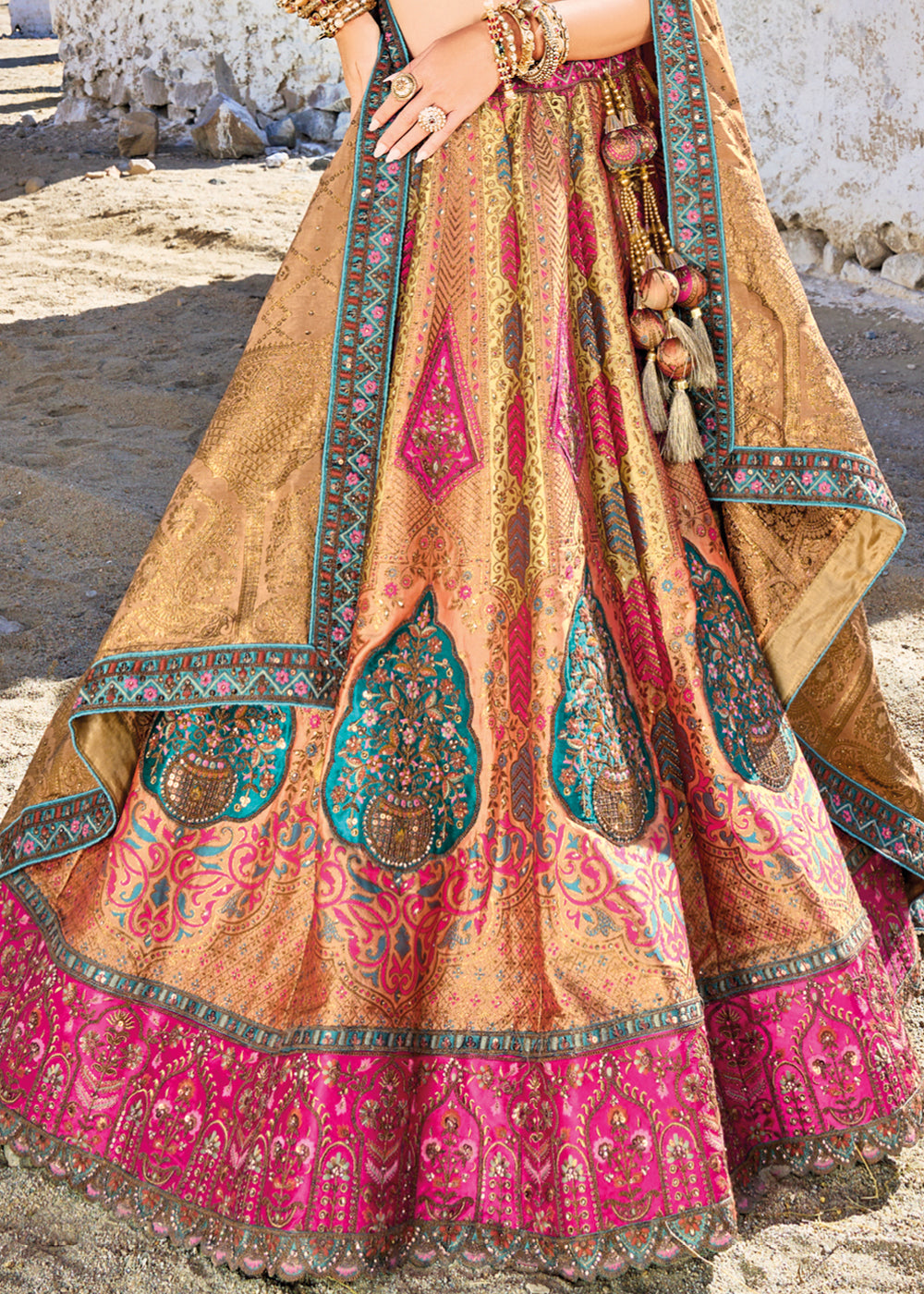 Multi Colored Banarasi Jacquard Silk Lehengas with Cut Work & Hand Work Embroidery