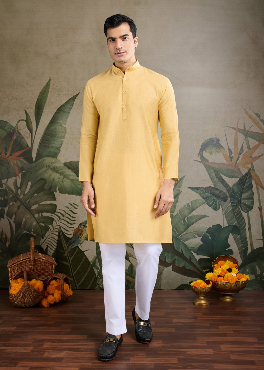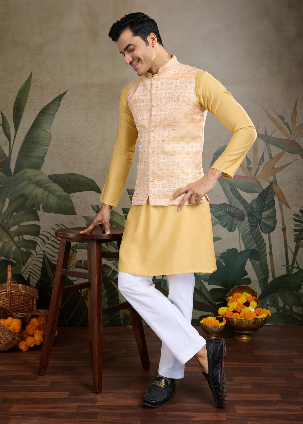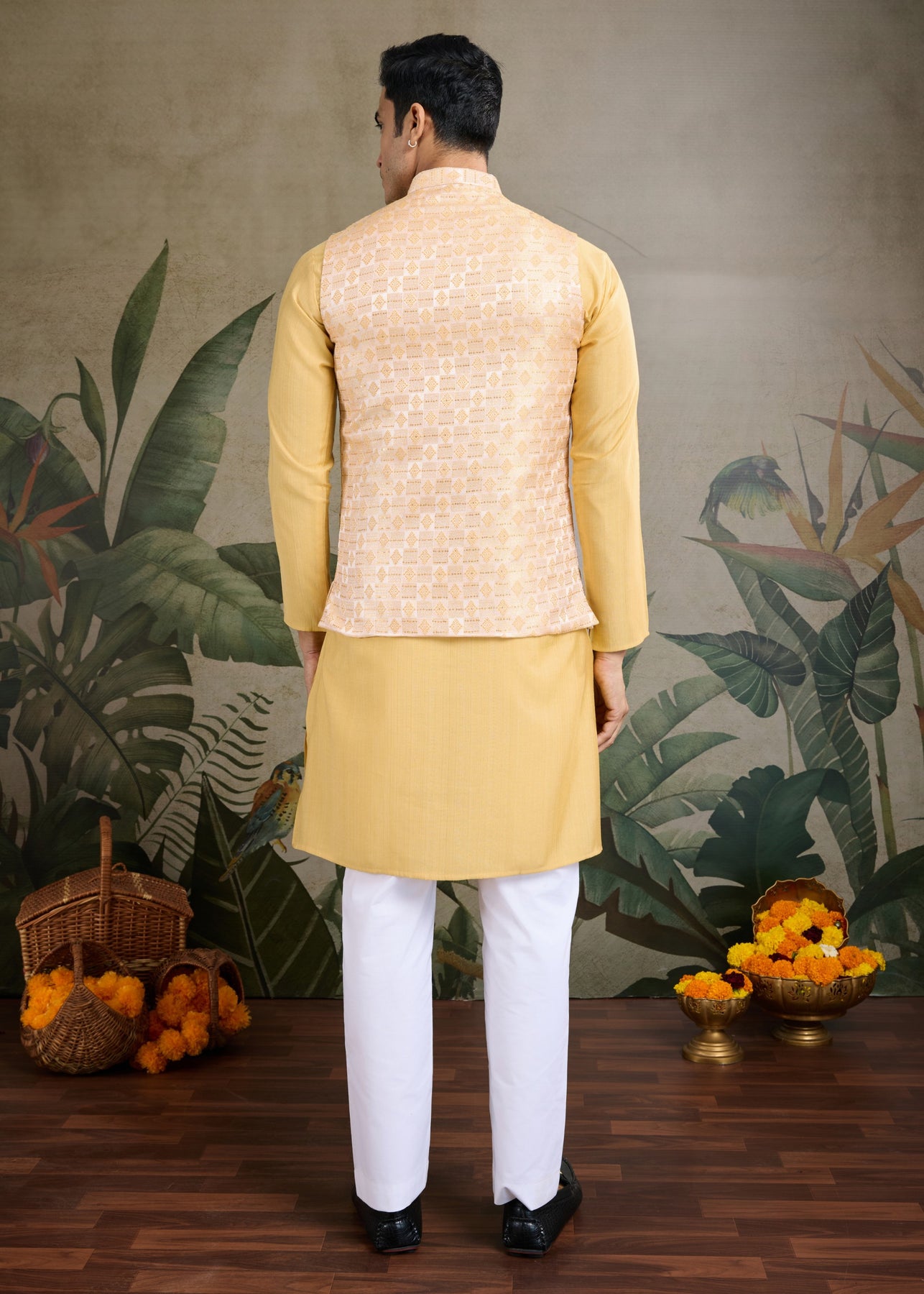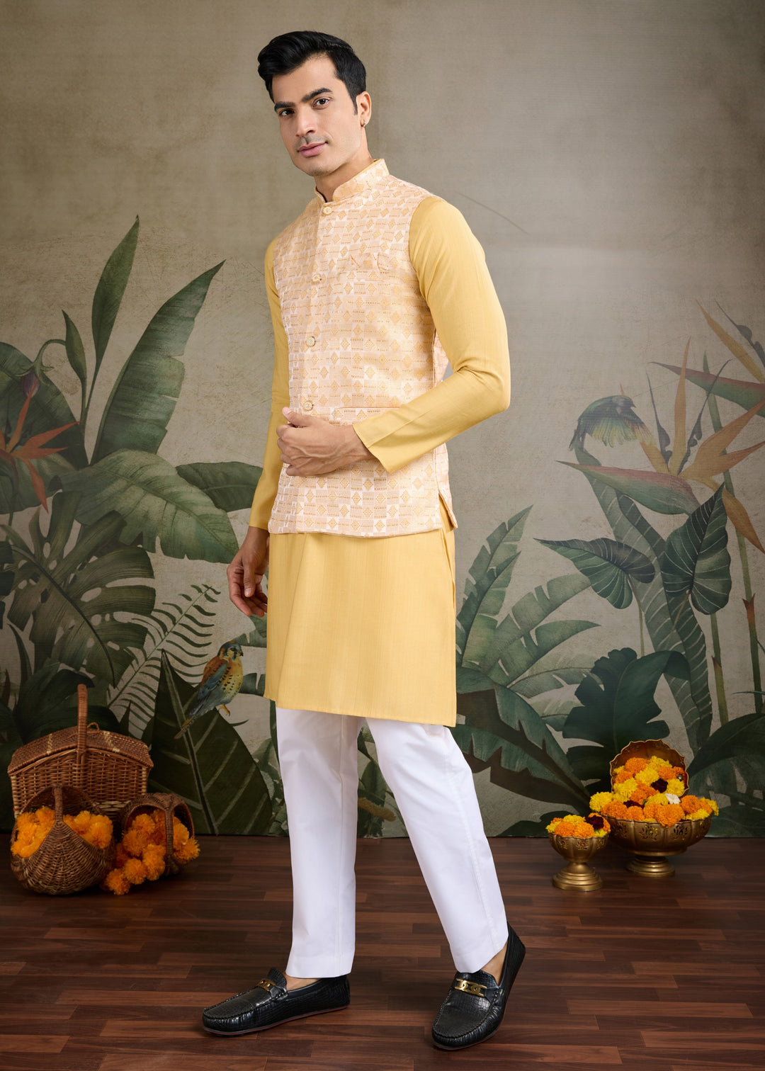 Elevate your traditional wardrobe with this elegant mustard-colored ensemble. This set includes a stylish koti (waistcoat), a matching kurta, and comfortable pajama pants, making it a perfect choice for festive occasions, weddings, or cultural events.