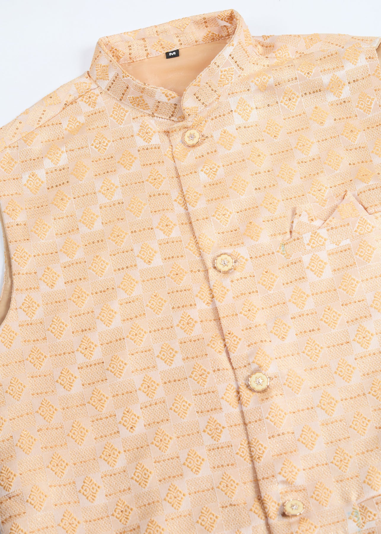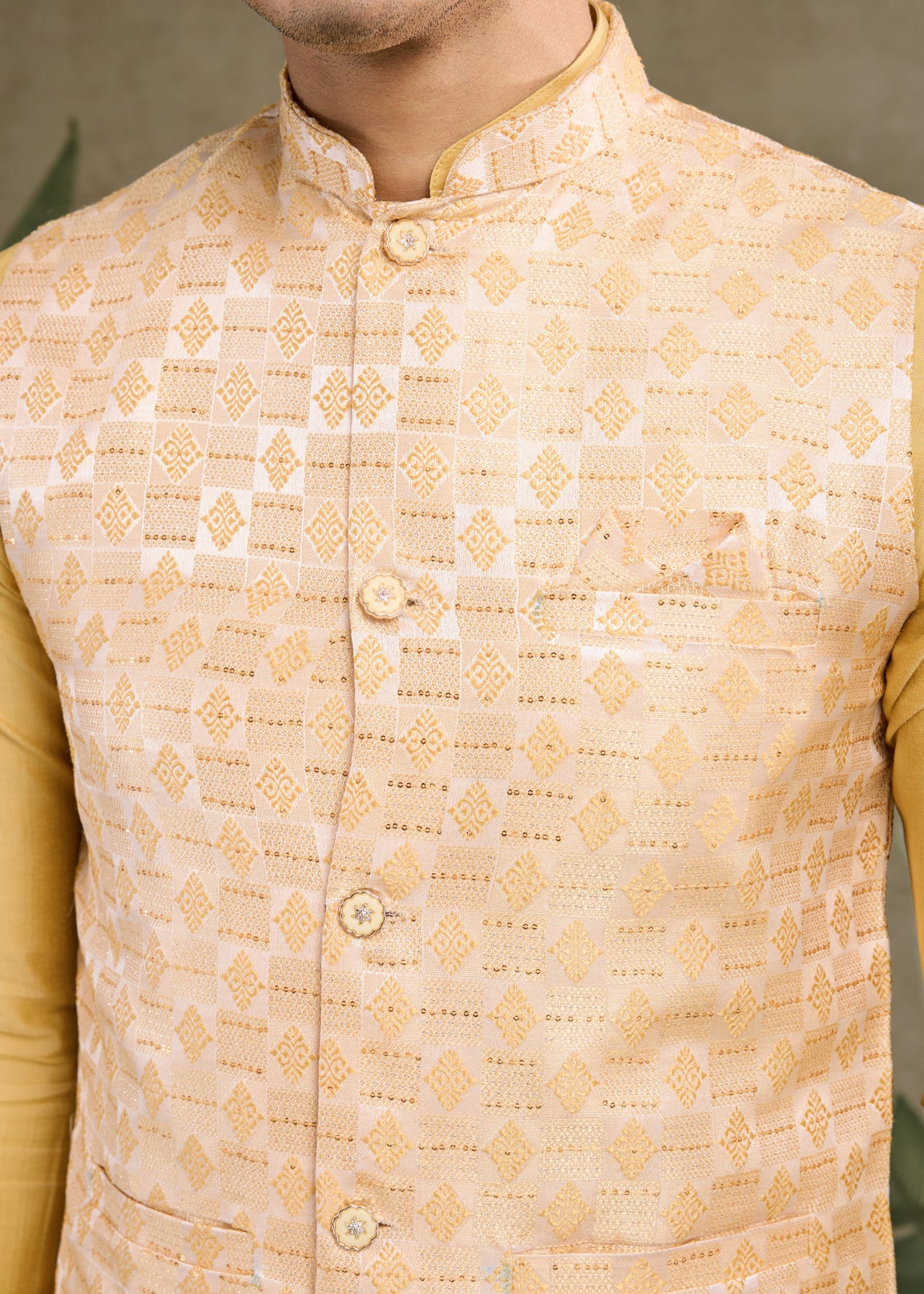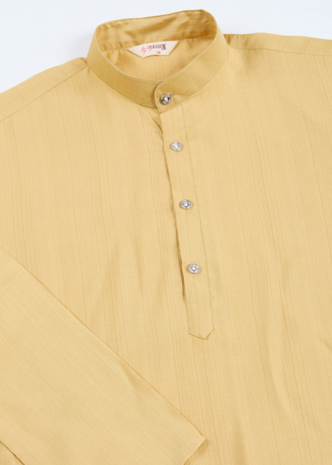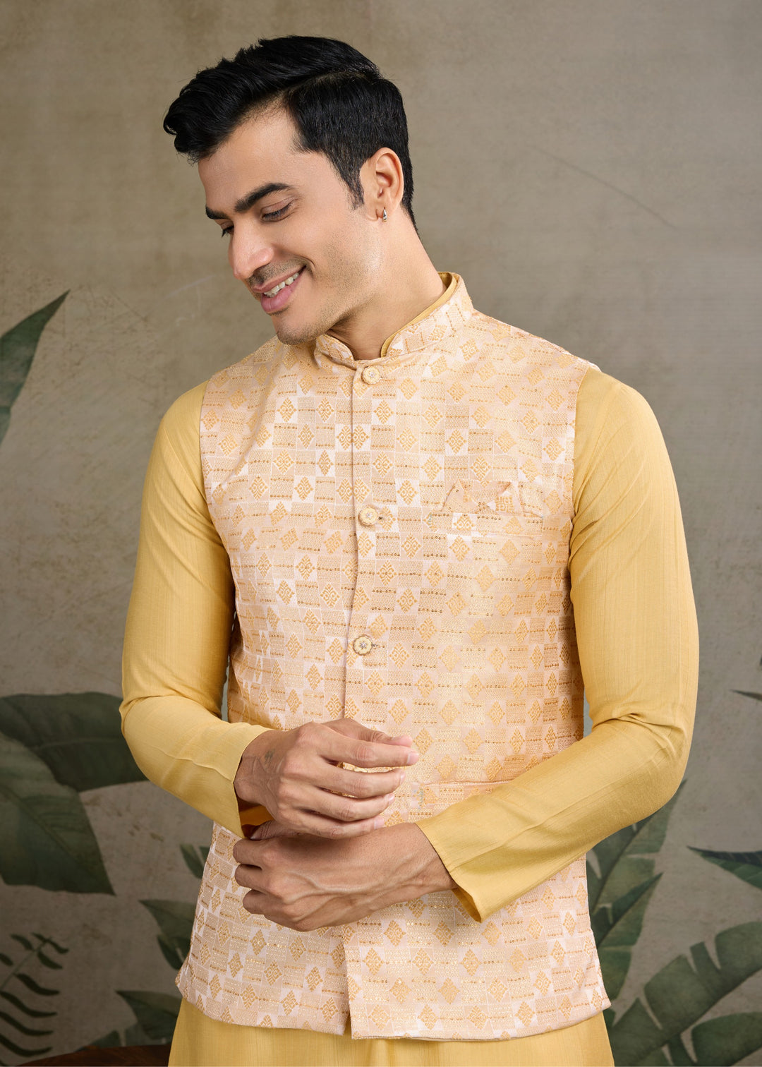 Elevate your traditional wardrobe with this elegant mustard-colored ensemble. This set includes a stylish koti (waistcoat), a matching kurta, and comfortable pajama pants, making it a perfect choice for festive occasions, weddings, or cultural events.