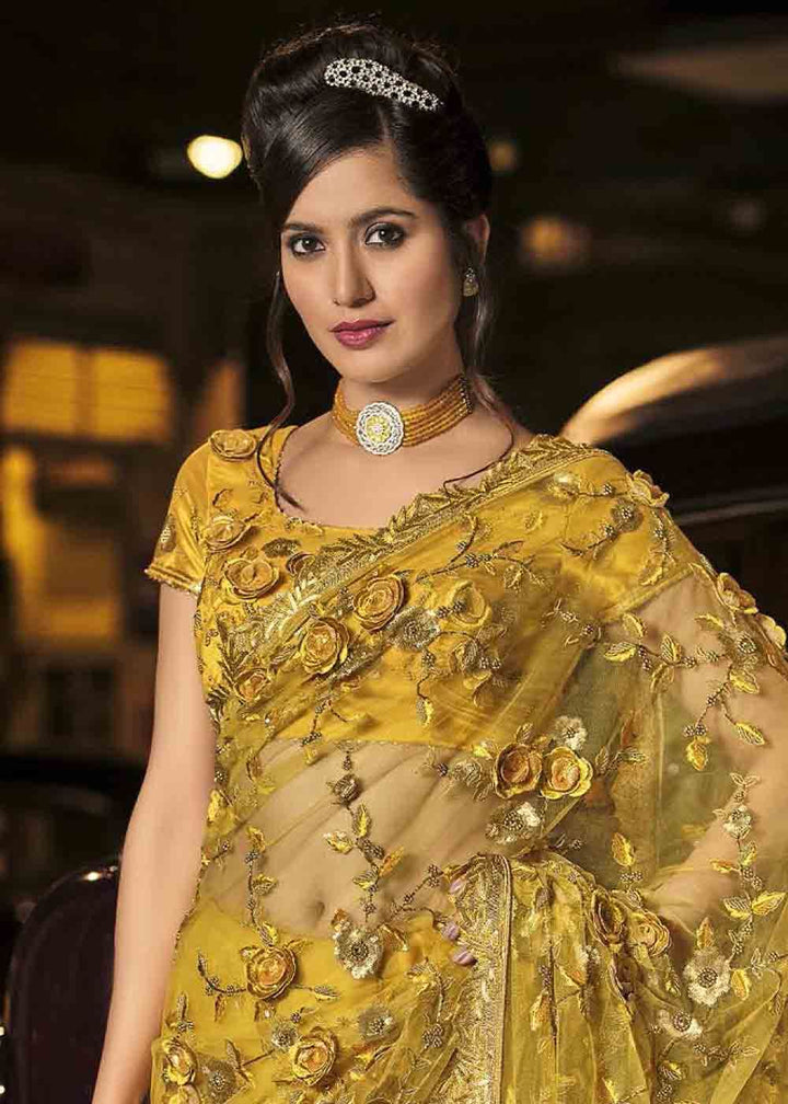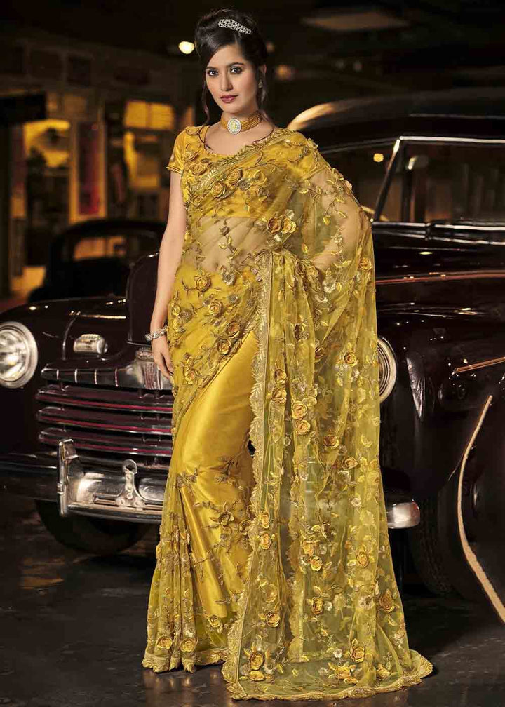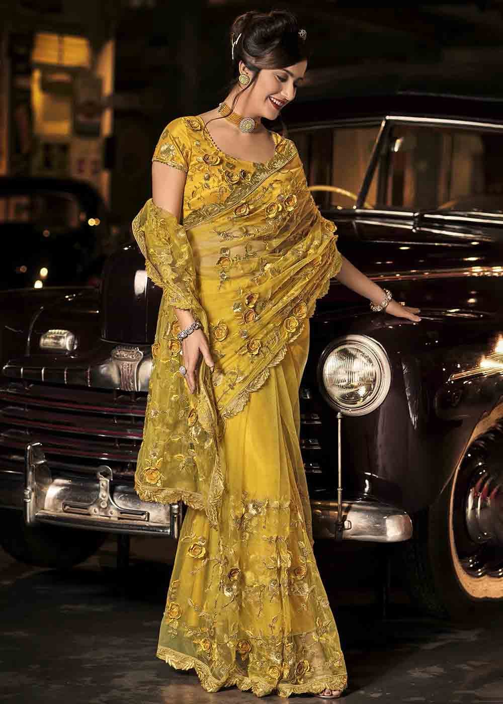 Mustard Yellow Designer Net Saree with Hand Made Flower, Moti & Cut Dana work