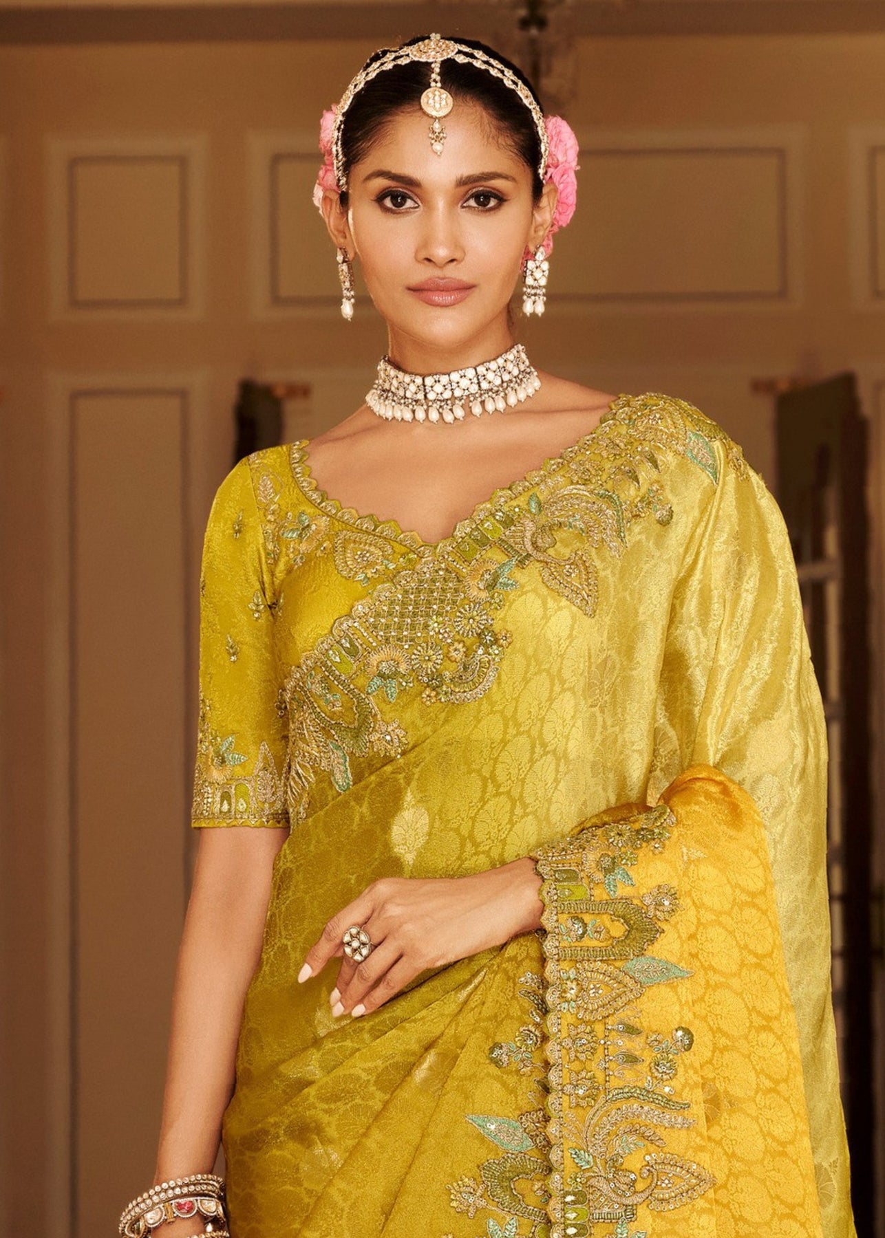 The mustard yellow silk saree is a perfect blend of regal charm and modern grace, making it a versatile choice for both traditional functions and contemporary celebrations. The blue-grey embroidery not only enhances the richness of the fabric but also creates a subtle play of contrasts that catch the eye without being overpowering. Its lightweight drape ensures comfort throughout long events, while the lustrous finish of silk adds a touch of sophistication to every movement.