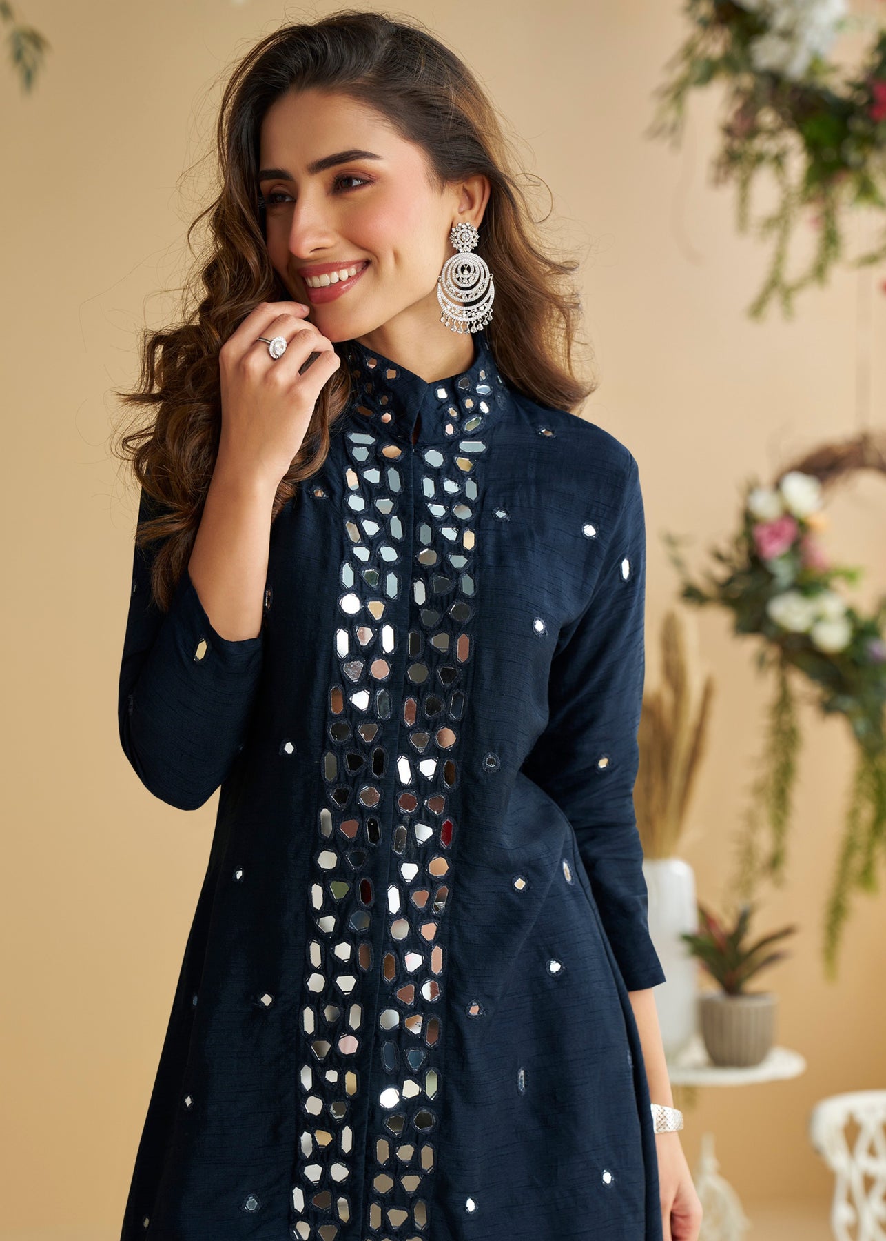 Beyond its obvious visual appeal, this piece is an artful expression of heritage craft and modern design—the deep, midnight navy silk draws you in with its luxuriant glow, while the silver mirror-work nods to centuries-old techniques of embellishment that sparkle subtly under the lights of an evening gathering.
