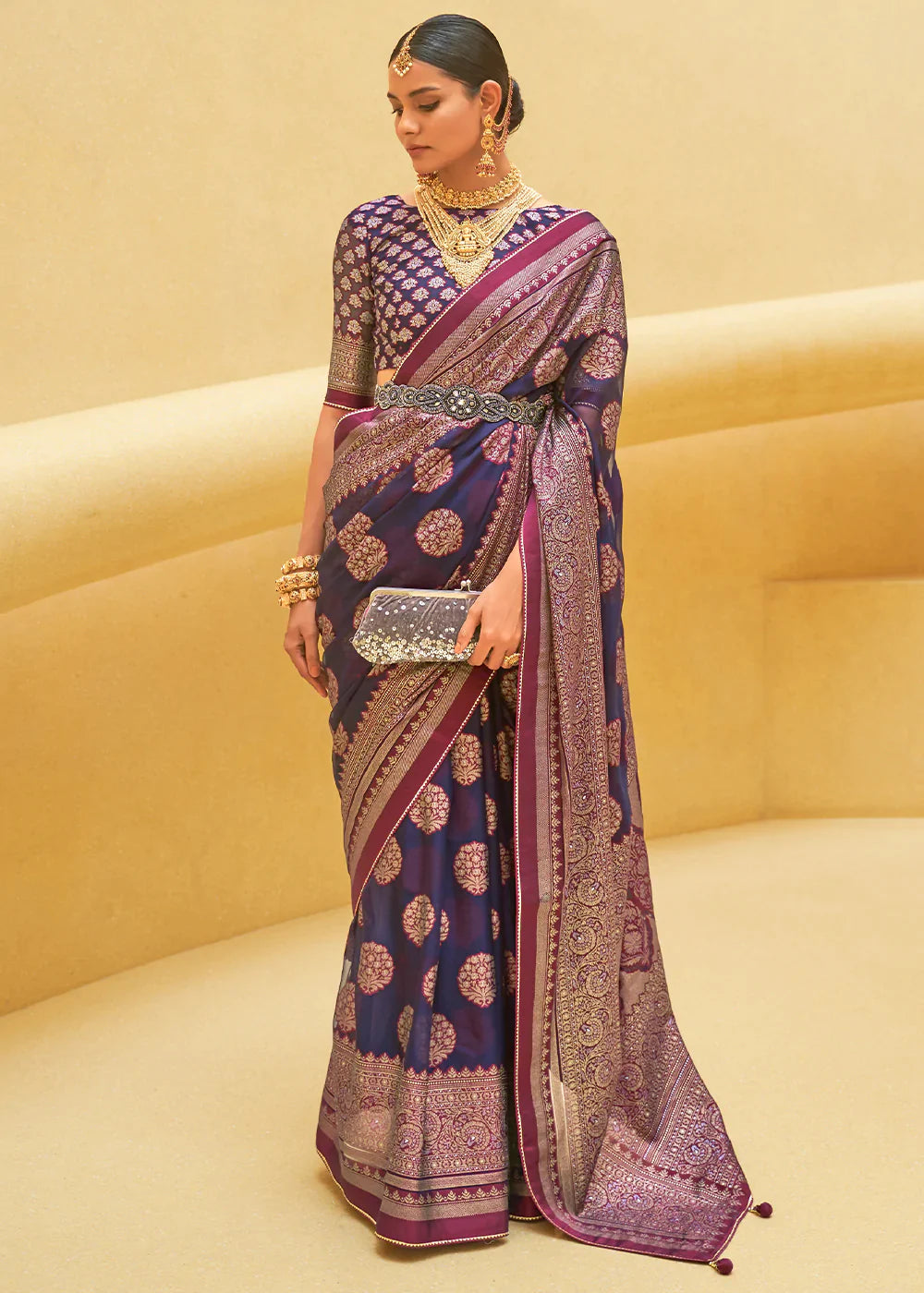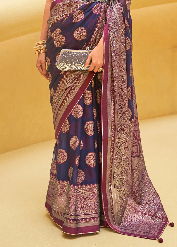 Navy Blue Zari Woven Brasso Organza Silk Saree