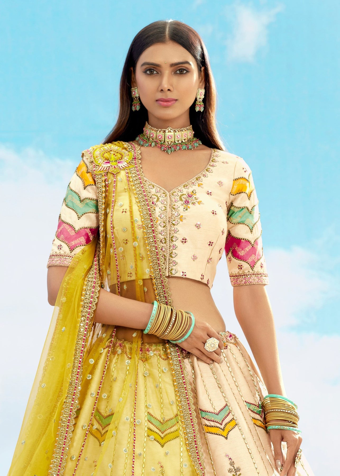 Off-White And Yellow Silk Lehenga With Cut Work Border