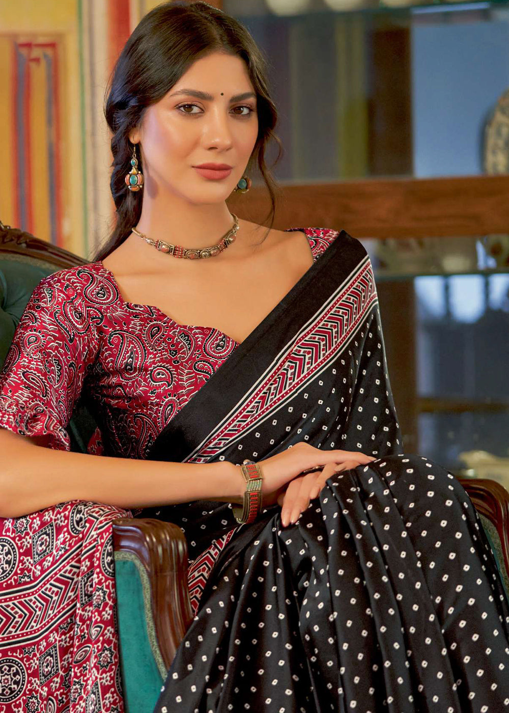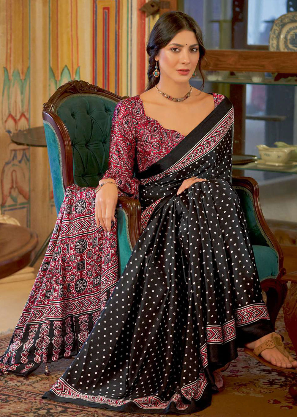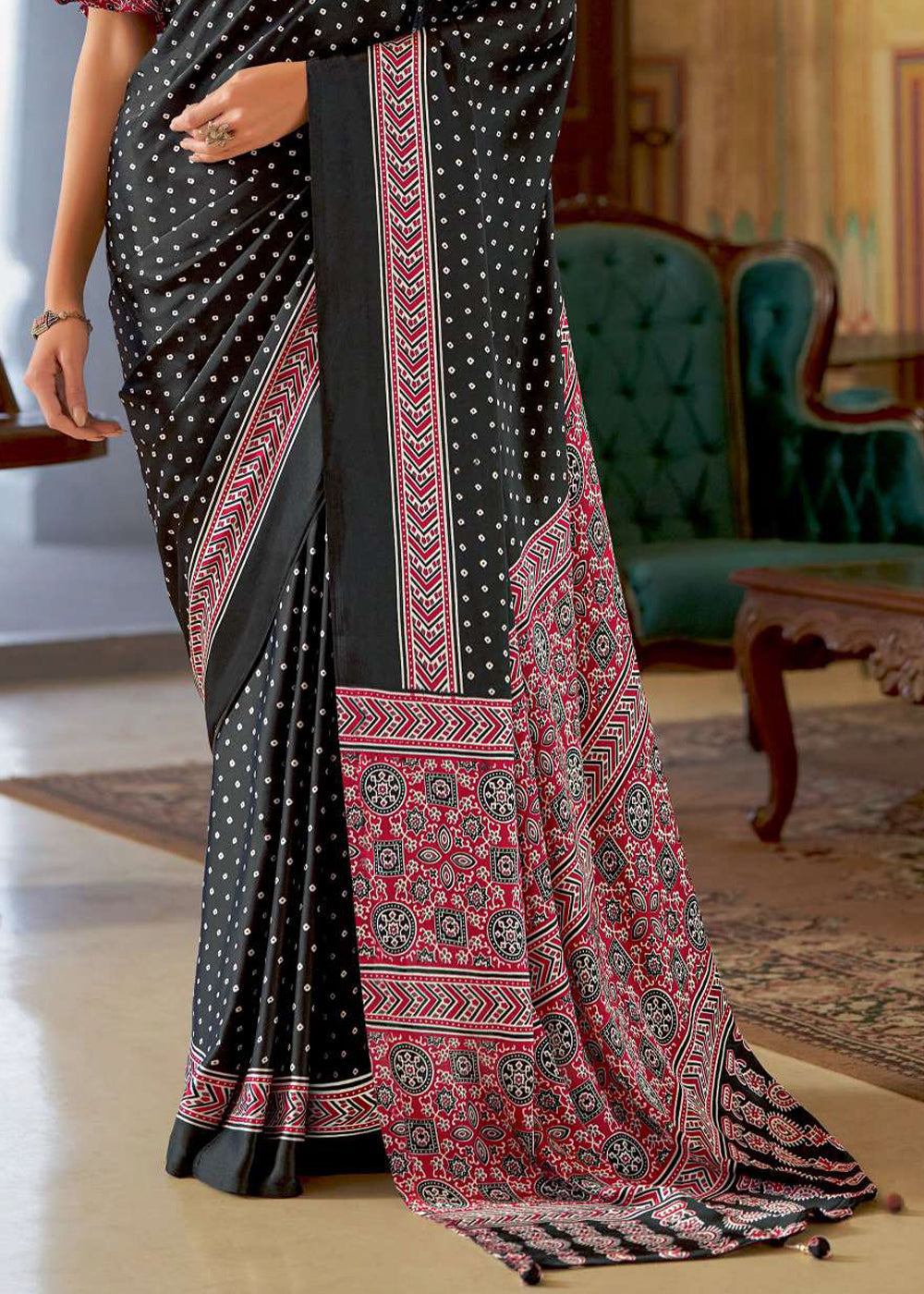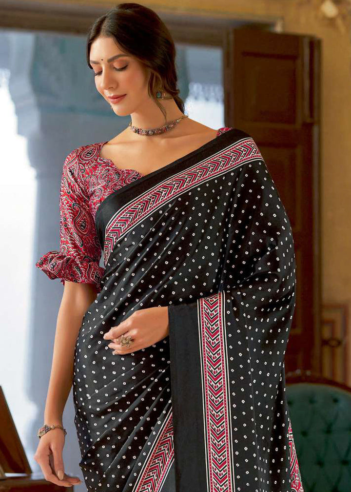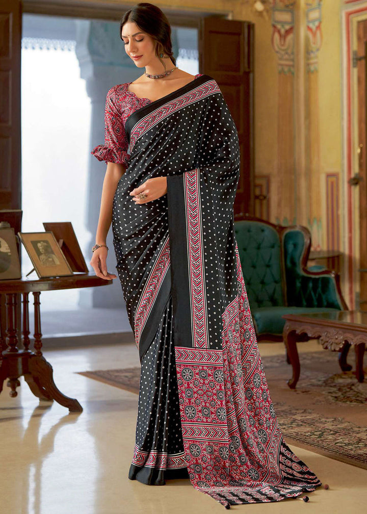 Onyx Black Ajrakh Printed Satin Crepe Saree:Summer Collection