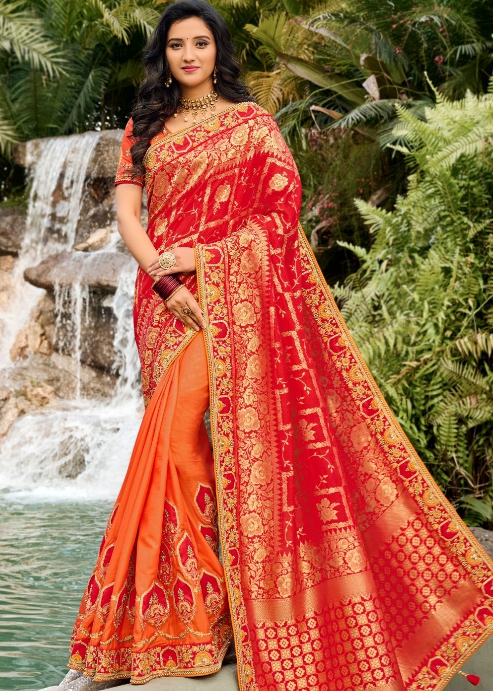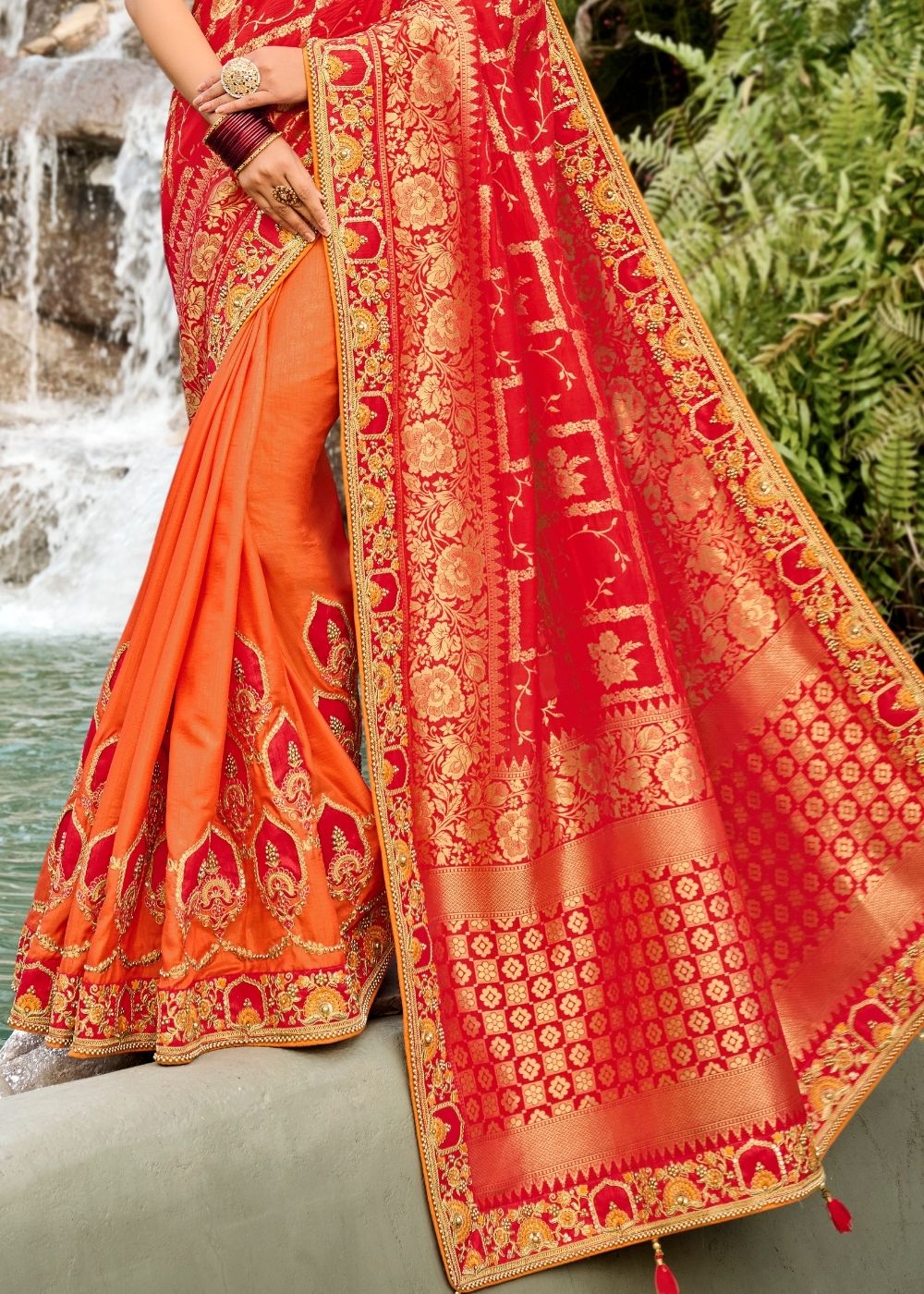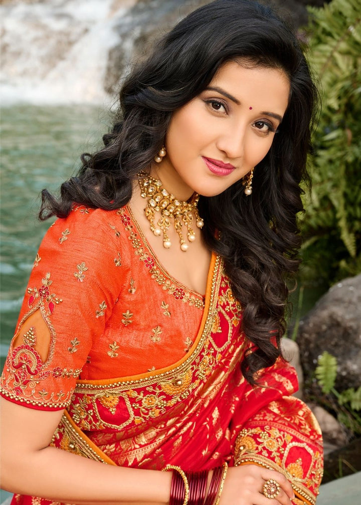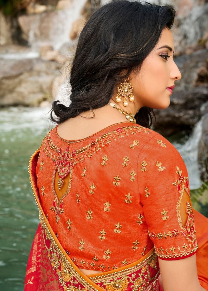 Orange and Red Half N Half Silk Saree with Embroidered work