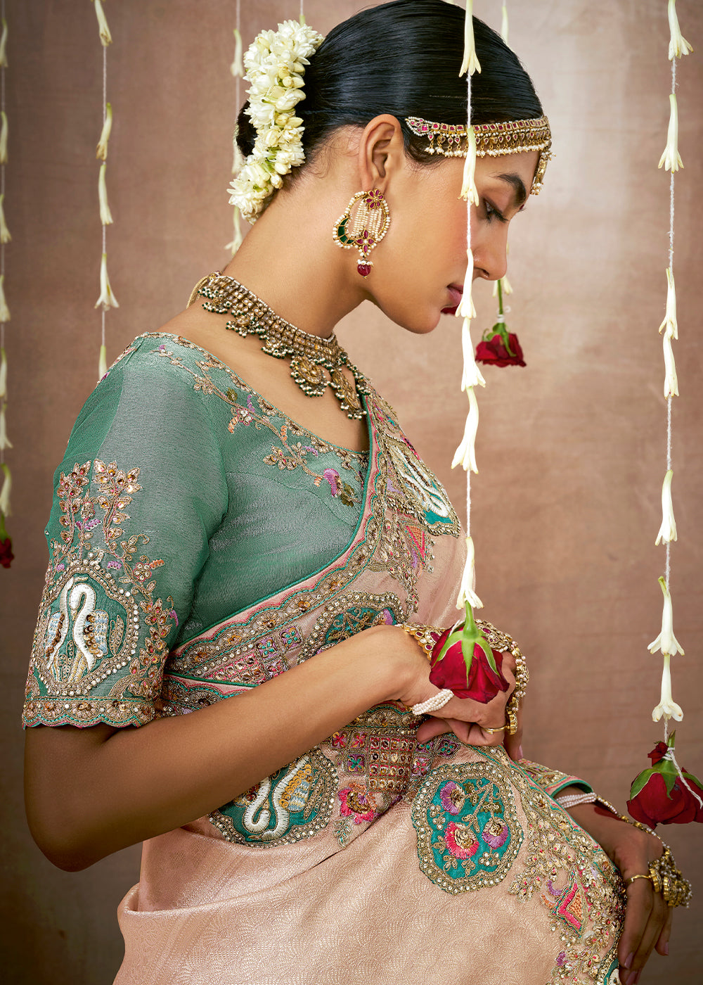 Pale Peach Pink Zari Woven Tissue Dola Silk Saree having Sequence, Pearl, Mirror & Thread Work: Festival Edition