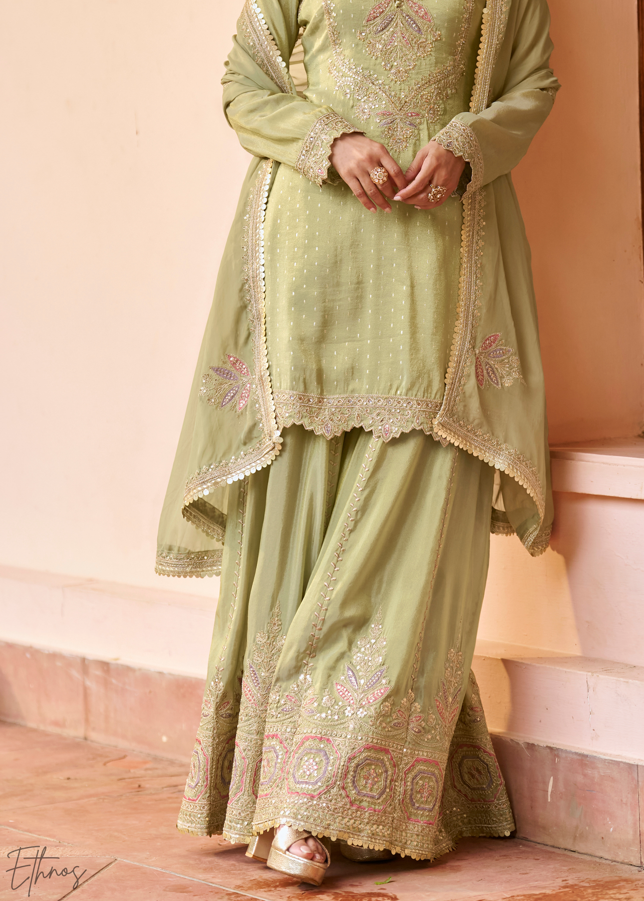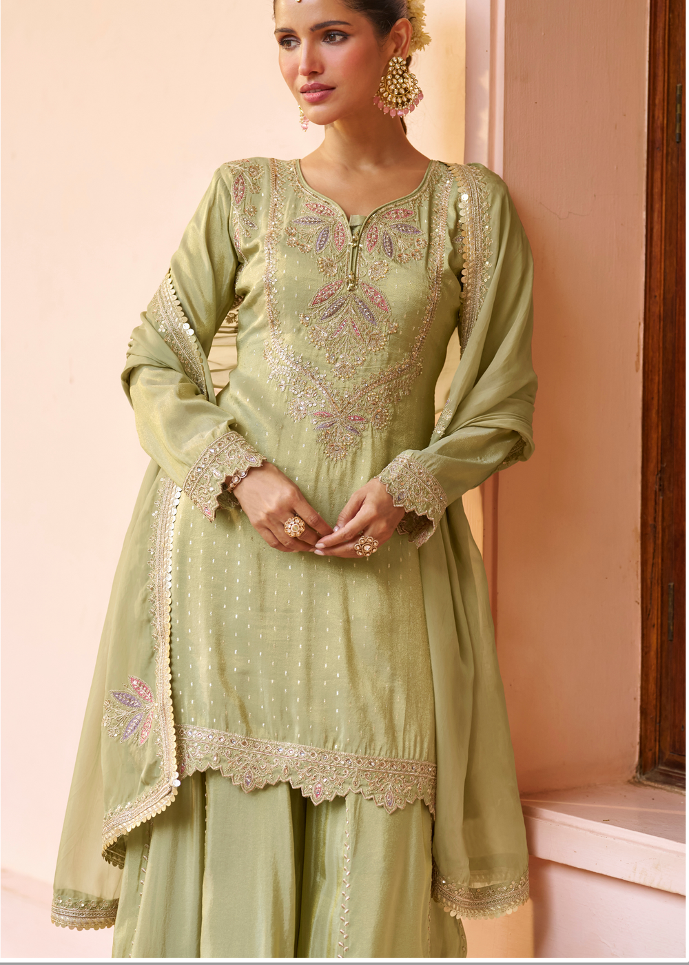 Drape yourself in dreamy pastel green elegance! This stunning sharara suit features luxuriously embroidered chinon fabric that steals the show—think intricate detailing across the front and back of the top, plus a gorgeously embellished border dancing along the bottom. Pure sophistication with a playful twist perfect for weddings & celebrations.
