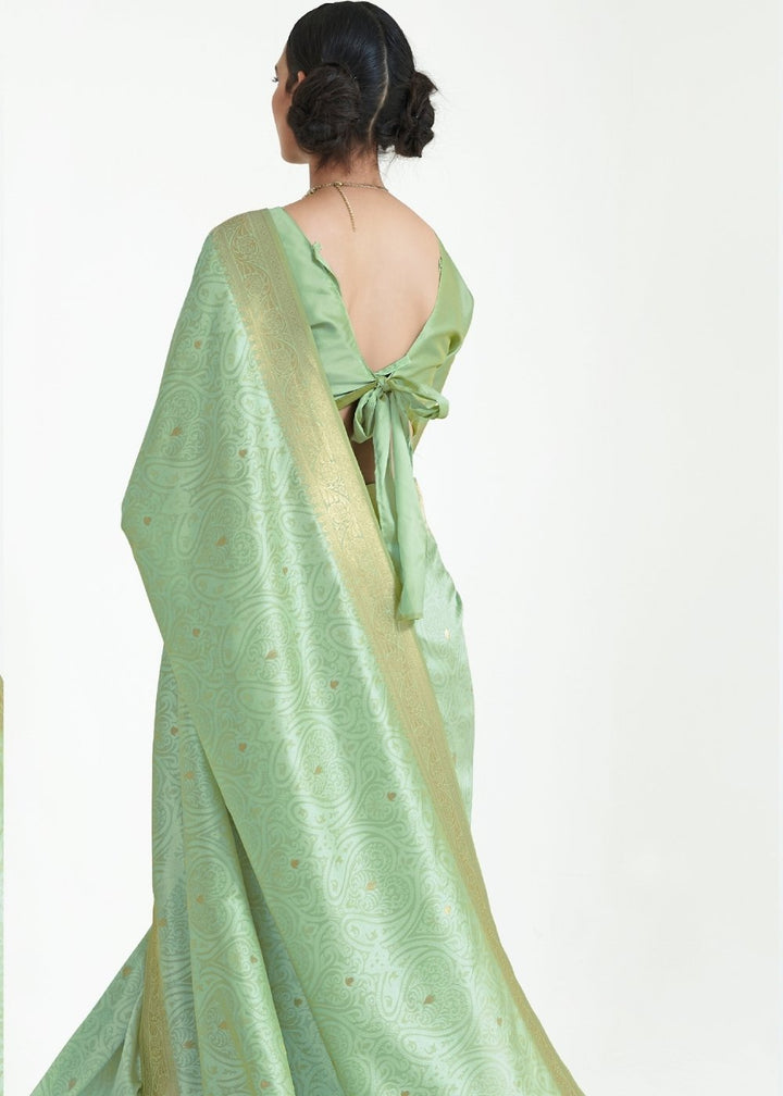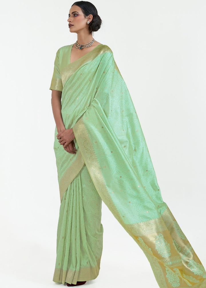 Wrapped in royal grace and charm, Kanjivaram silk sarees are timeless and are made by twisting and weaving premium silk yarns. Usually designed in a combo of two colors, these make the wearer stand out in sophistication and style. This soothing Pastel Green drape comes beautified with an engaging border and Pallu to give you a lifetime of happiness.