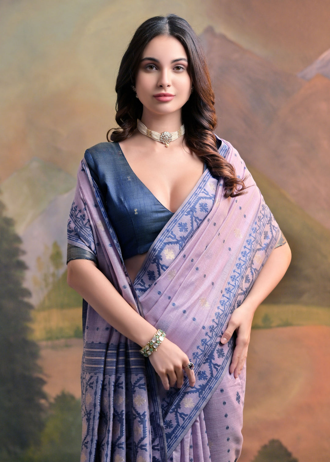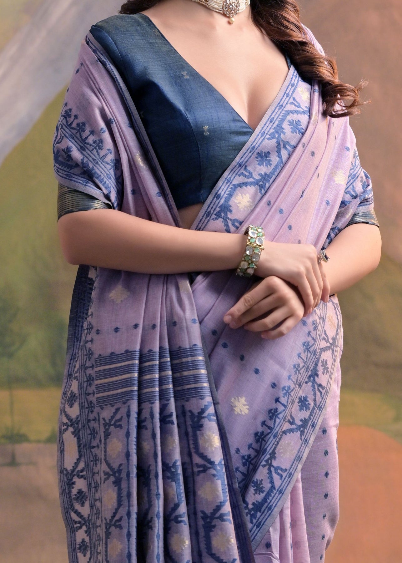 This pastel purple saree is crafted from woven cotton, featuring intricate all-over butti designs that add a delicate charm. Its lightweight fabric offers comfort, while the soft color palette enhances its timeless elegance. Ideal for both casual and festive occasions, this saree combines tradition with modern appeal. Complete with a matching blouse piece, it's a versatile addition to any wardrobe.
