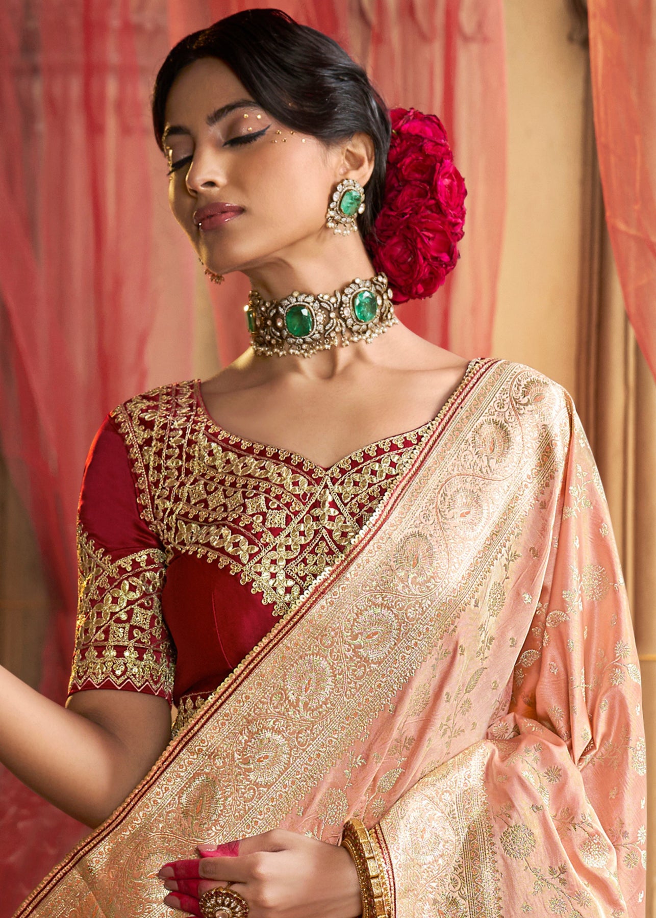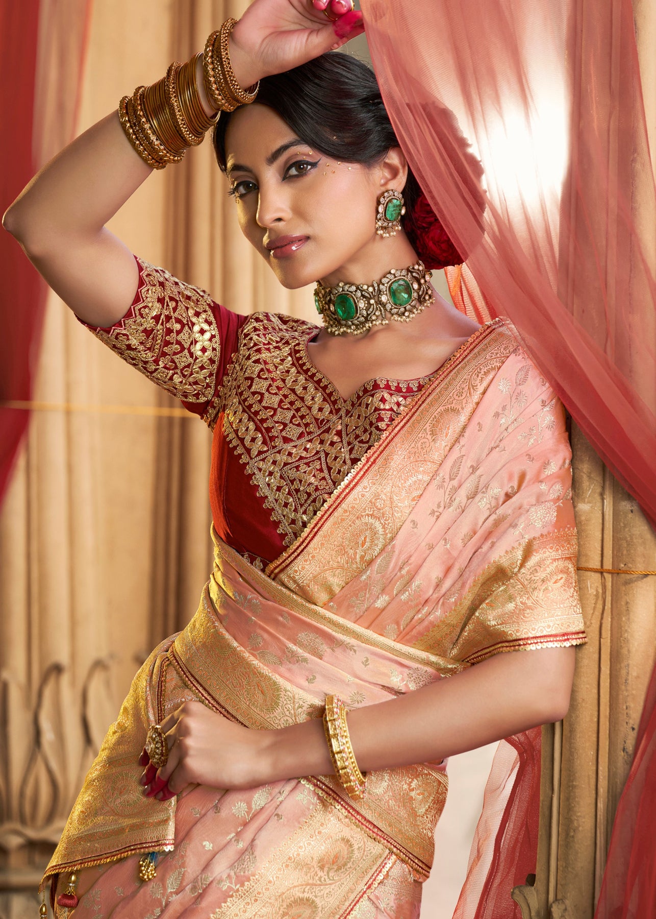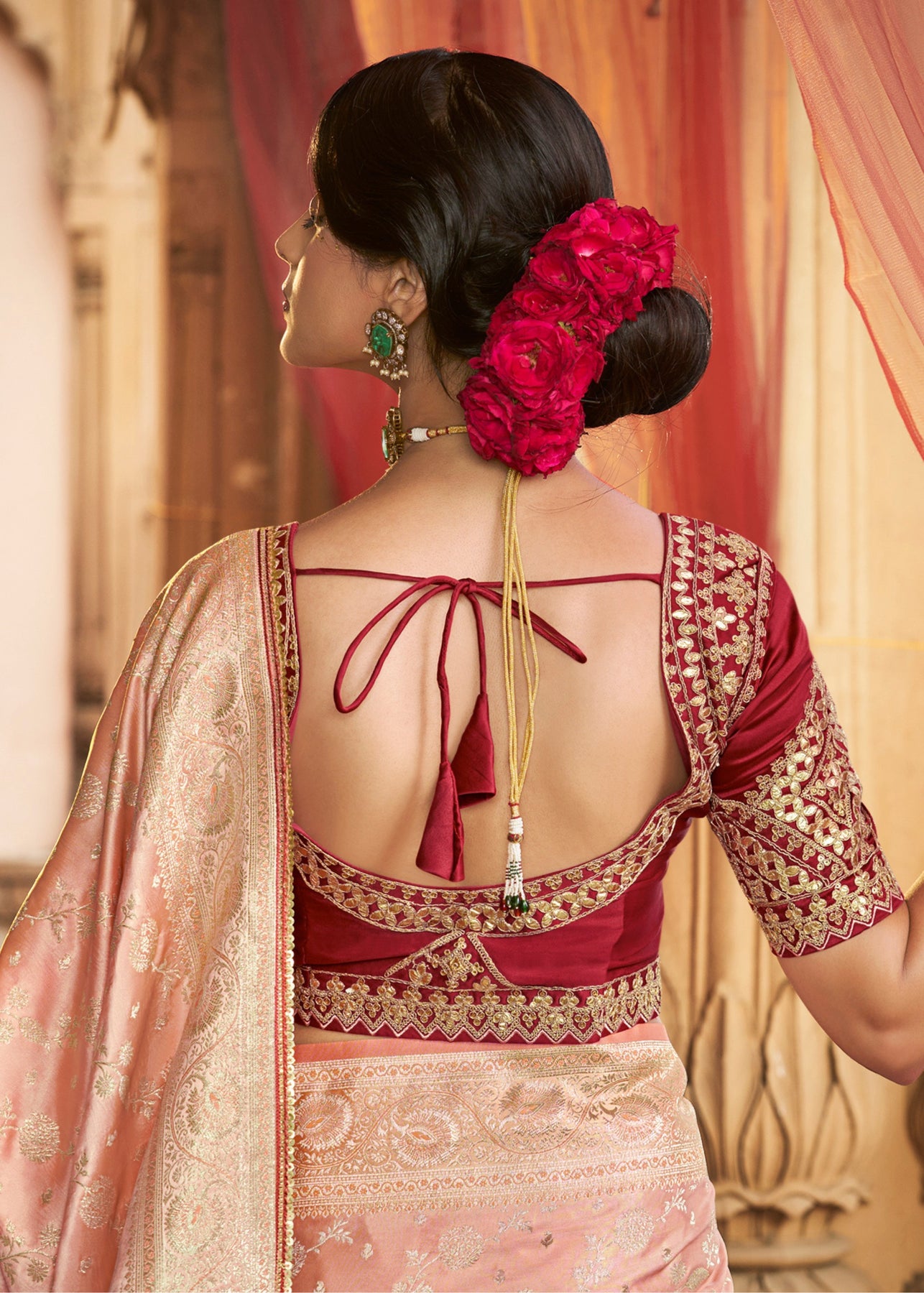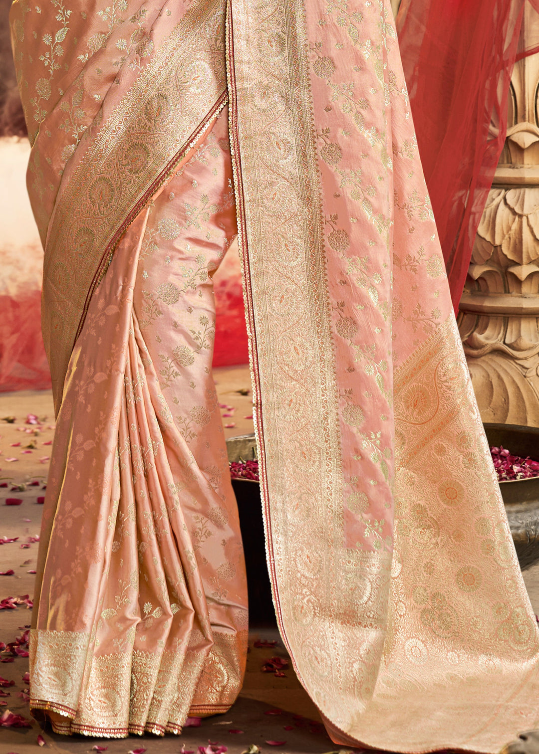 Peach Satin Silk Saree With Beautiful Lace Border And Heavy Designer Embroidered Blouse