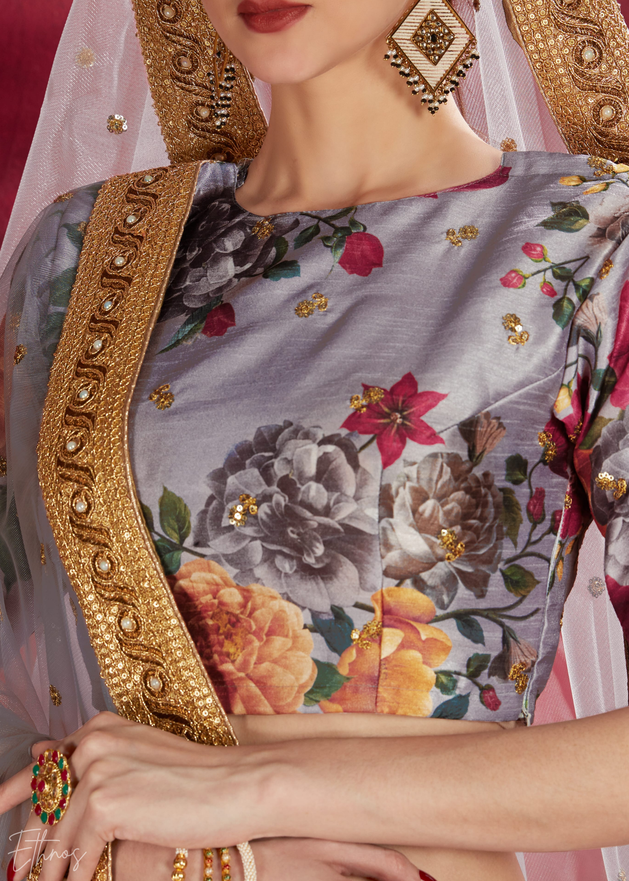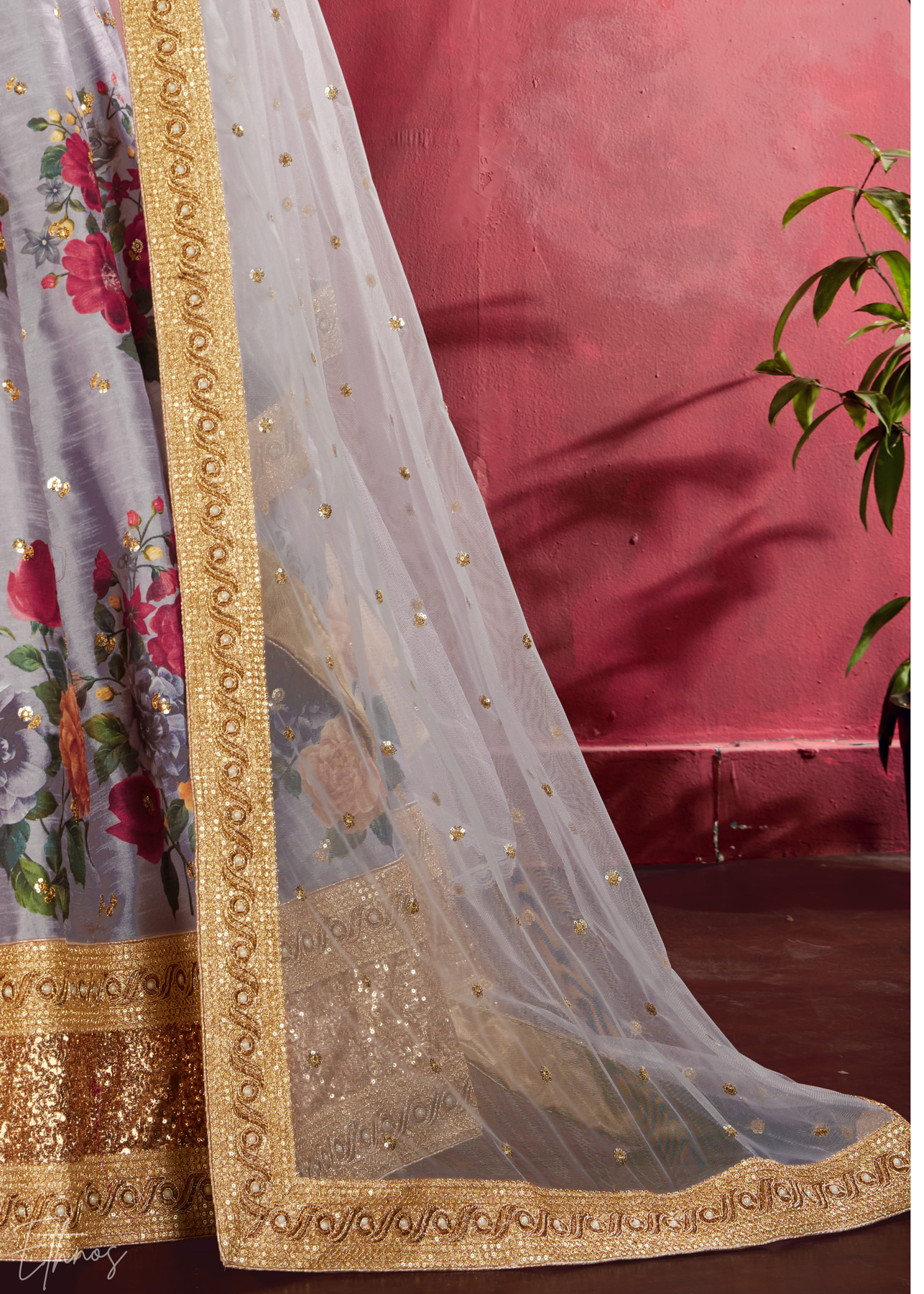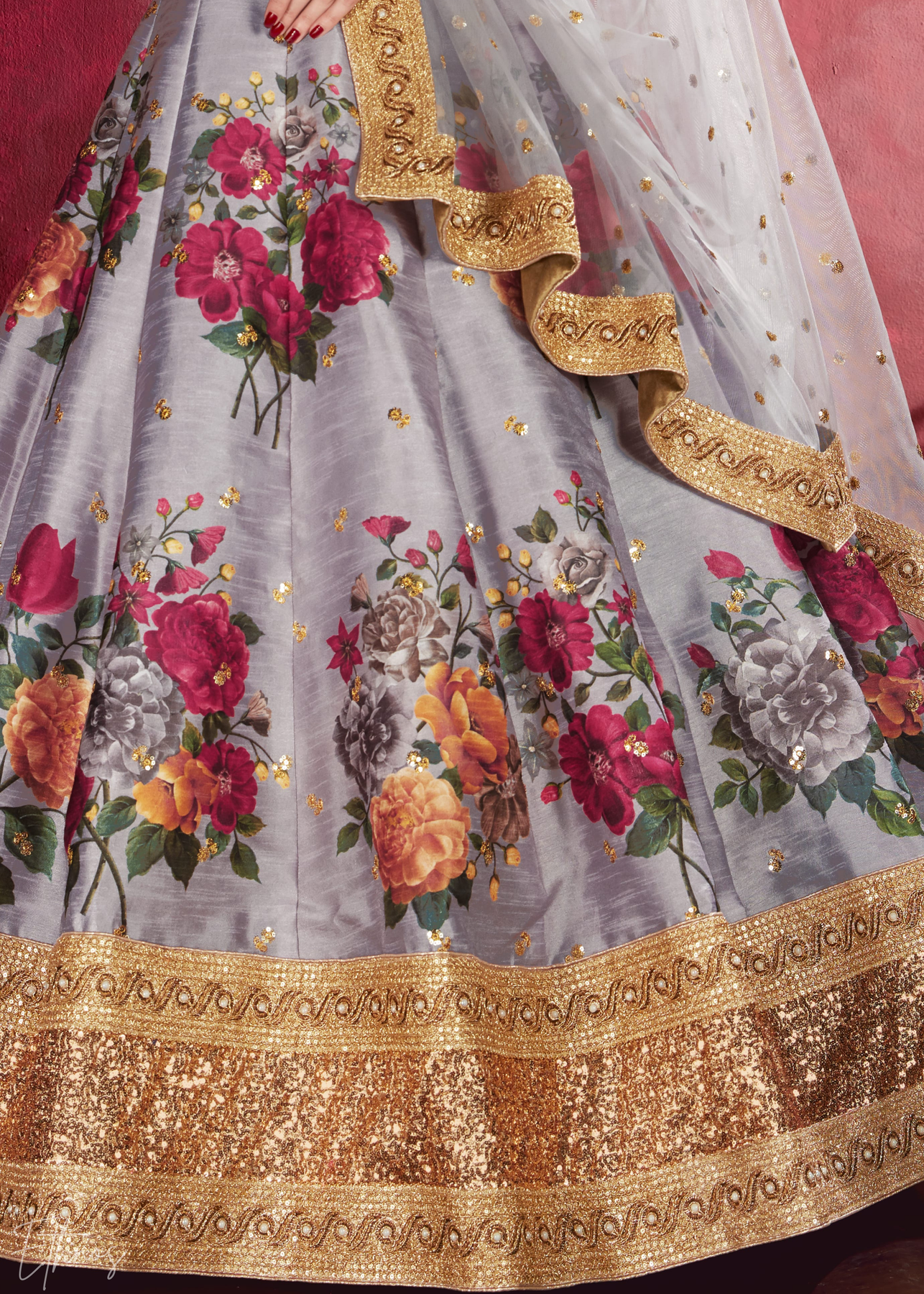 Elevate your ethnic wardrobe with this exquisite grey silk-blend lehenga, featuring a masterpiece of vibrant floral digital prints and a regal, gold-sequined border. This premium ensemble is perfectly paired with a delicate, sheer dupatta edged in matching embroidery, making it an sophisticated choice for grand weddings, festive galas, and high-end celebrations.