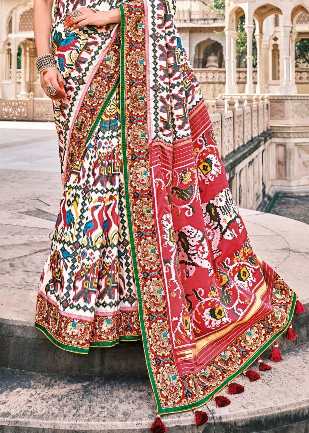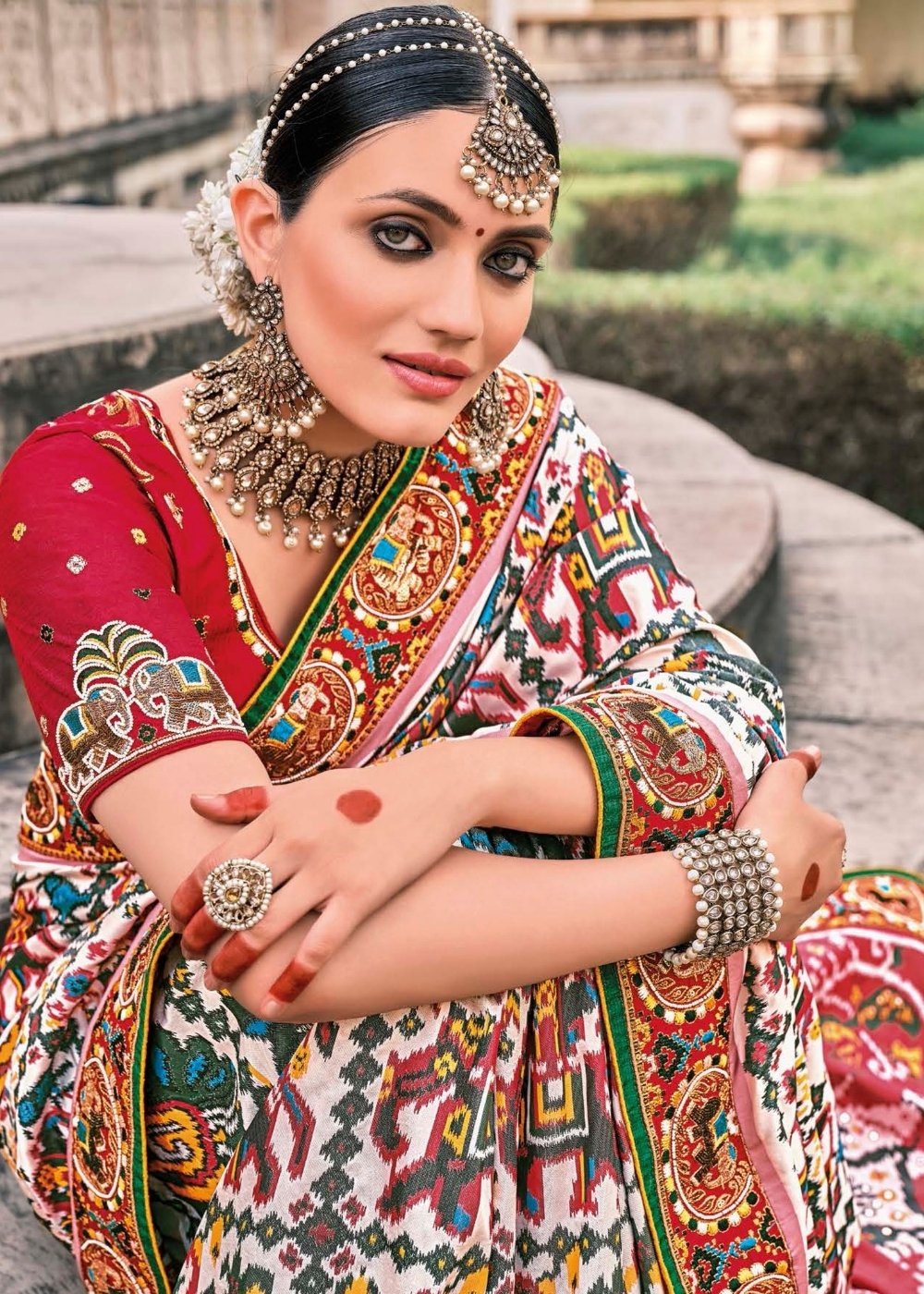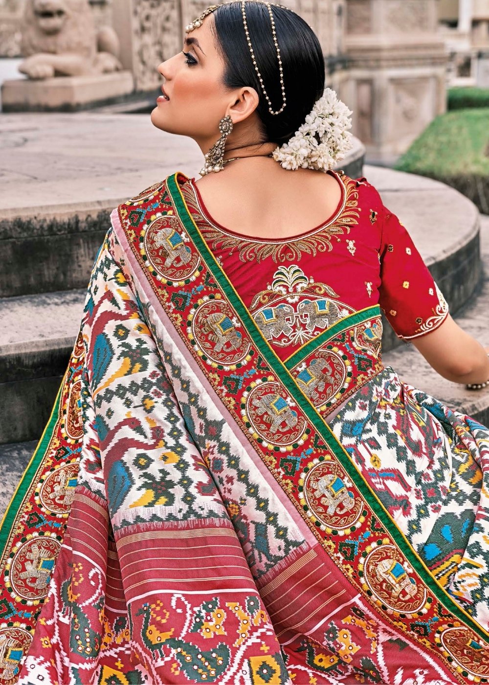 Pearl White Patan Patola Silk Saree with Embroidered Blouse