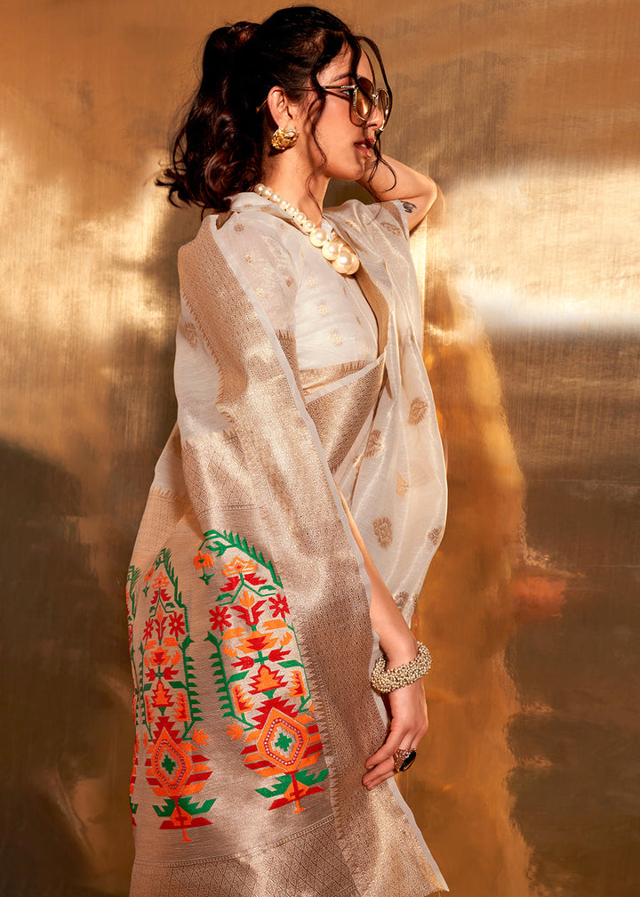 Pearl Beige White Zari Woven Tissue Silk Saree Having Paithani Pallu: Top Pick