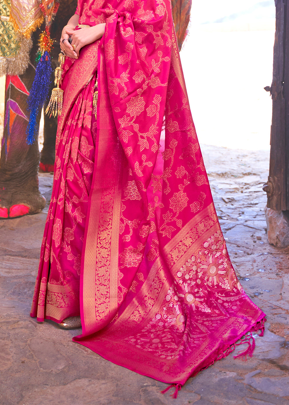 Celebrate traditions, celebrate the joy! Make your auspicious festivities more promising and joyful with this alluring delight. This Peony Pink Handloom Weave Soft Banarasi Silk Saree is a traditional classic weave that is synonymous with our tradition. Embellished with a gorgeous border and contemporary florals, this will be an outstanding festive wardrobe companion.