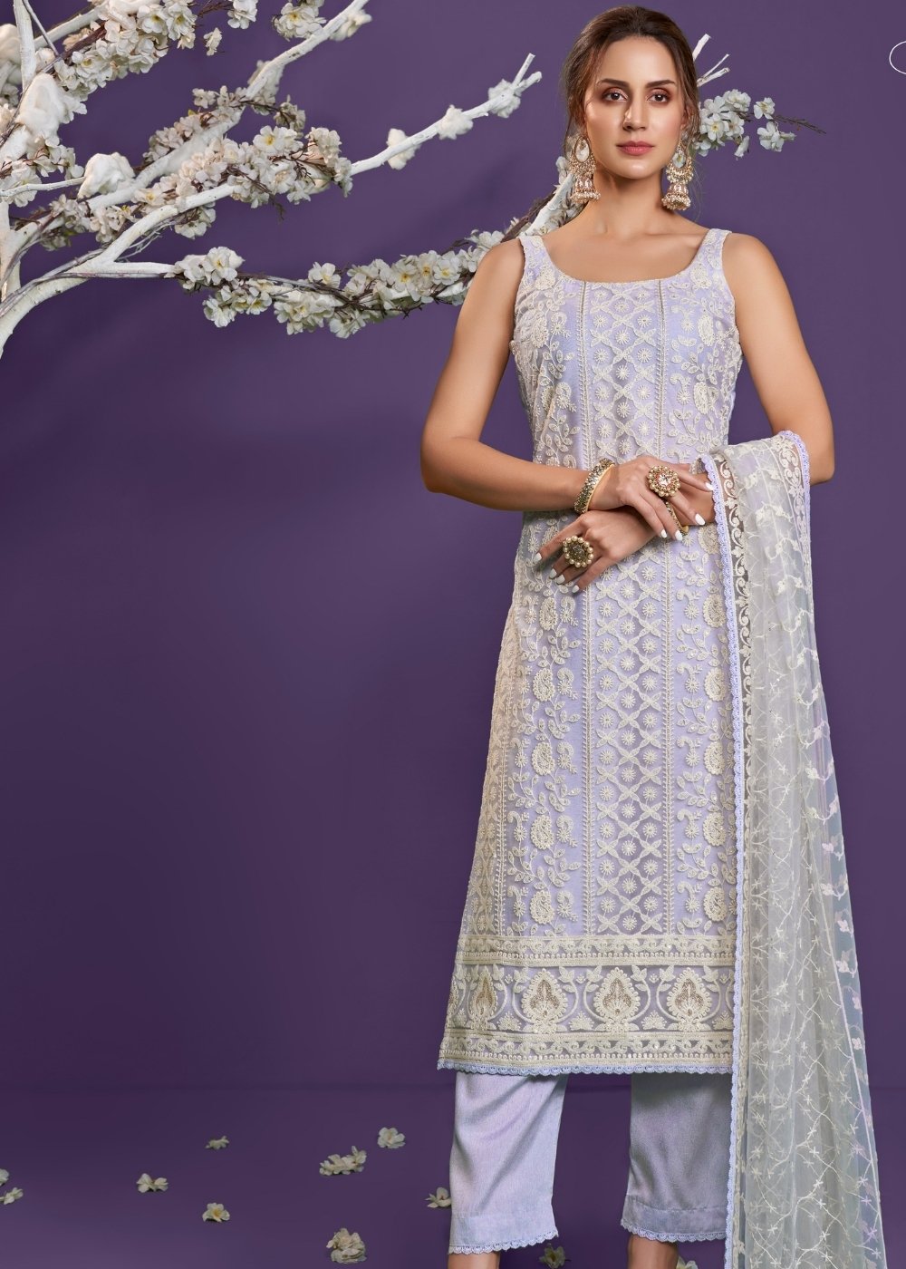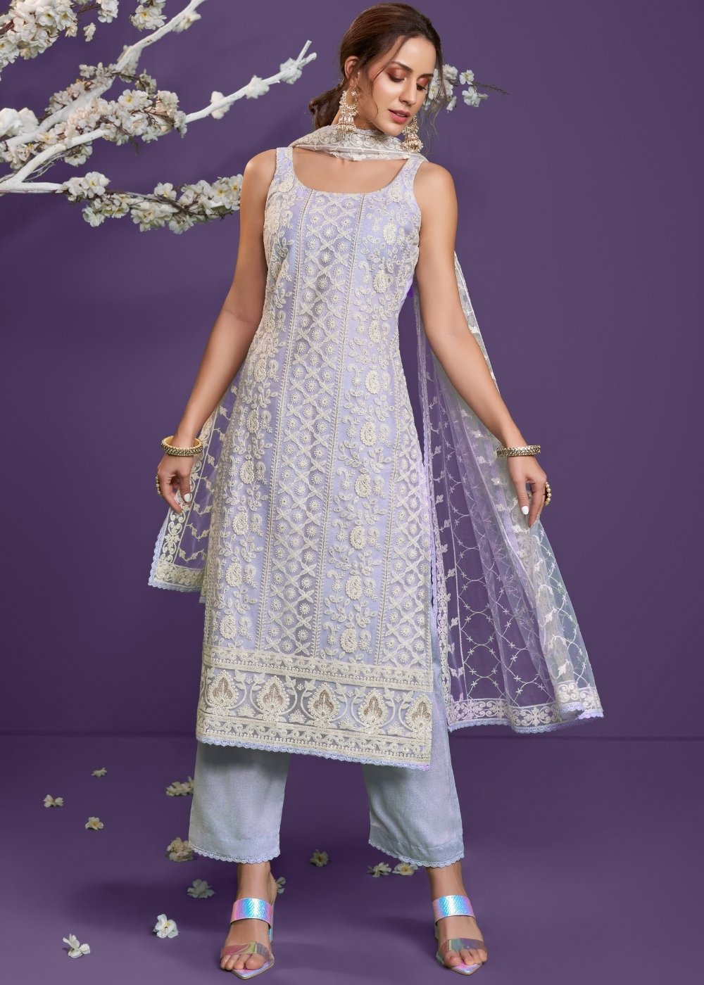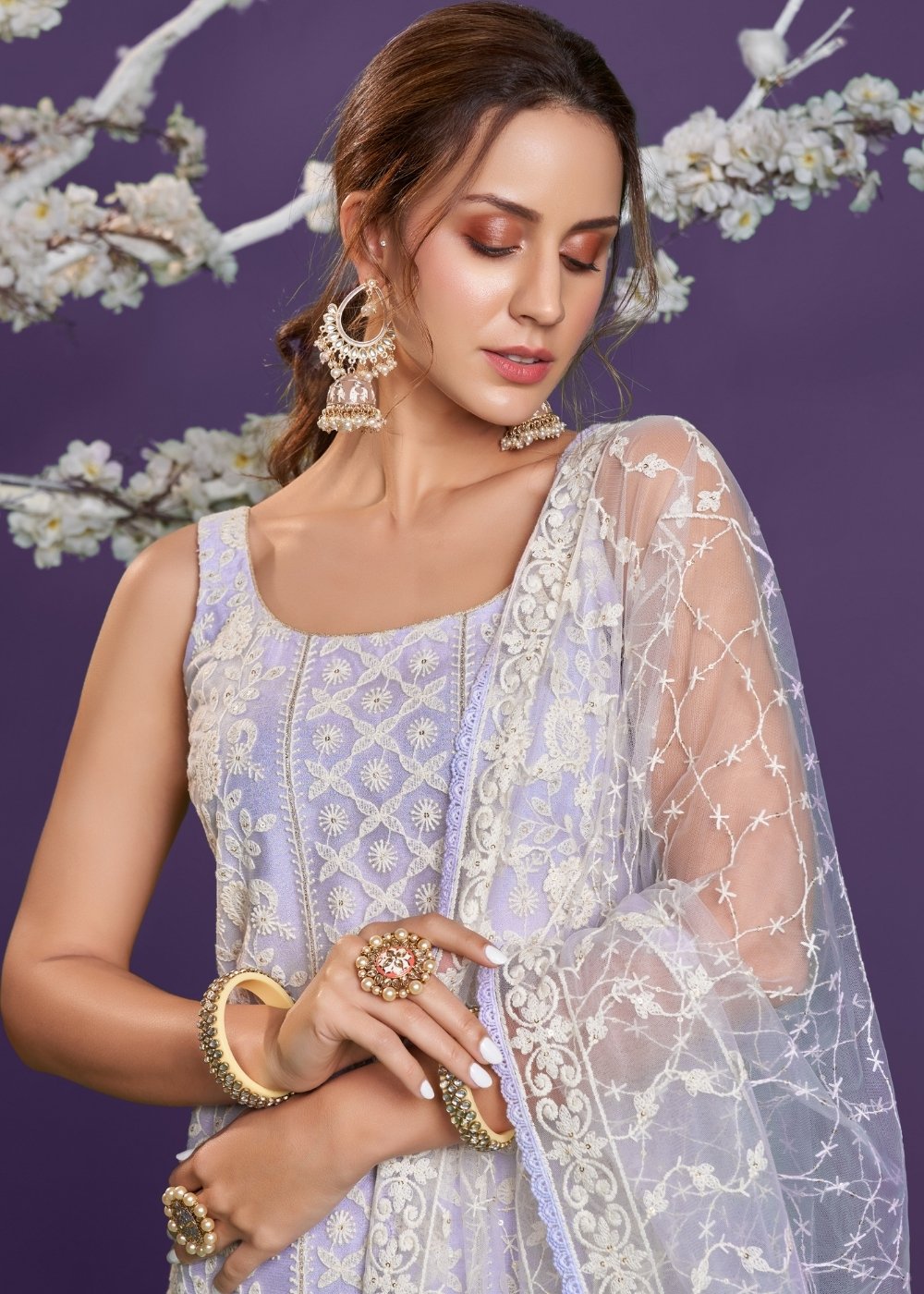 Periwinkle Purple Net Lucknowi Salwar Suit with Cotton Thread Embroidery & Sequence work