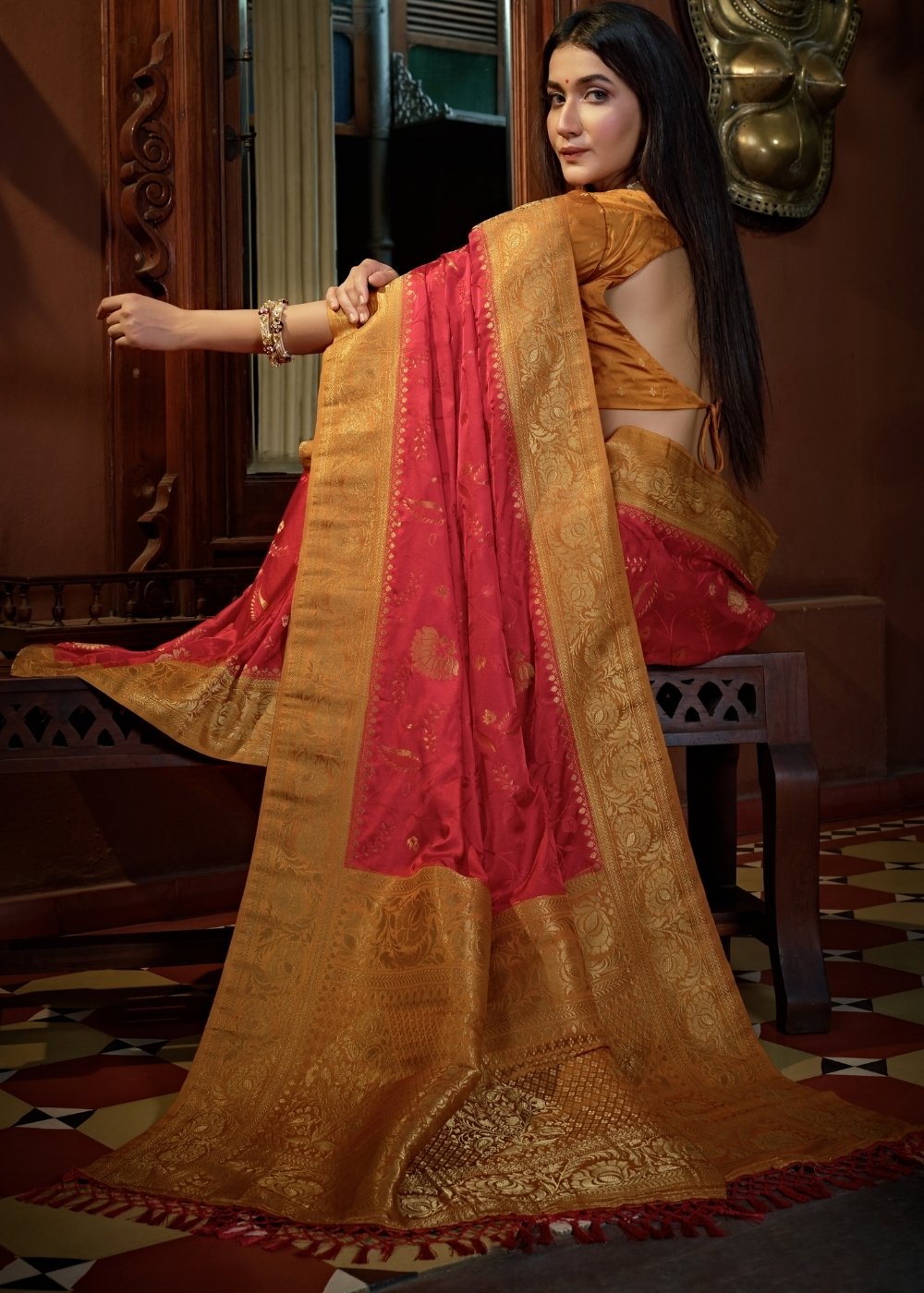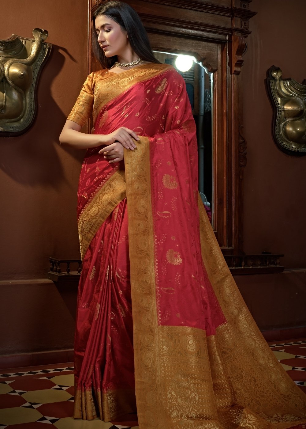 The glossy and supple Persian Red saree is the stunner of all, complemented by the alluring designs all over. Satin Silk is one of the best choice for any festivities or celebration which creates a very graceful look. A natural and hypo-allergic fabric which is easy to wear and durable. Pamper yourself with this piece and make the heads turn while impressing all.