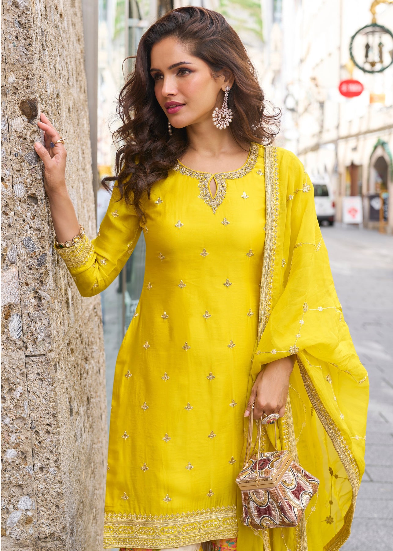 Pineapple Yellow Chinon SIlk Palazzo Suit With Embroidered Work : Top Pick