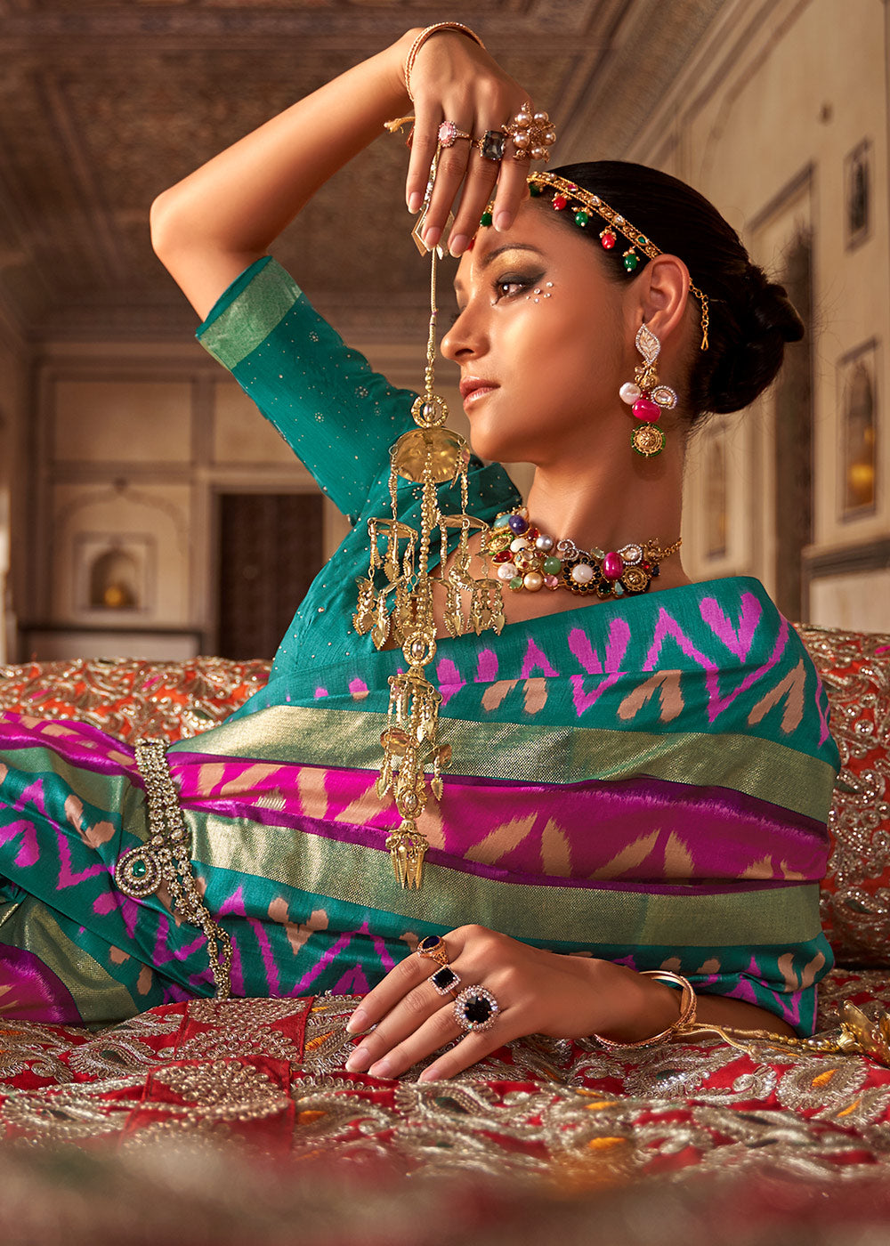 Dola silk sarees promise exceptional strength and a lovable texture that every saree lover adores. This Printed Patola Dola Silk Saree has evolved through generations by the finest and most laborious artisans. A dazzling zari border and elegant shade of Pink and Blue make this saree a magnificent delight for your wardrobe.