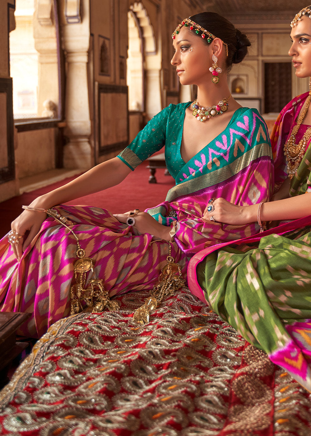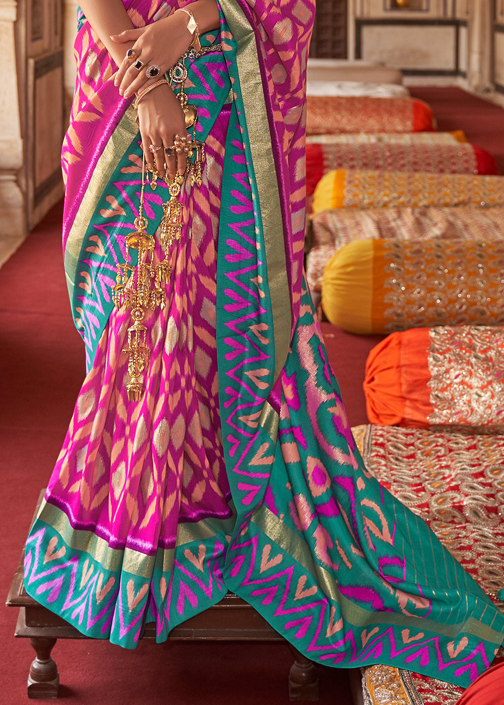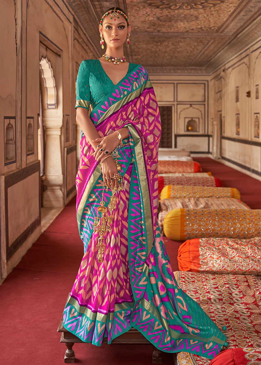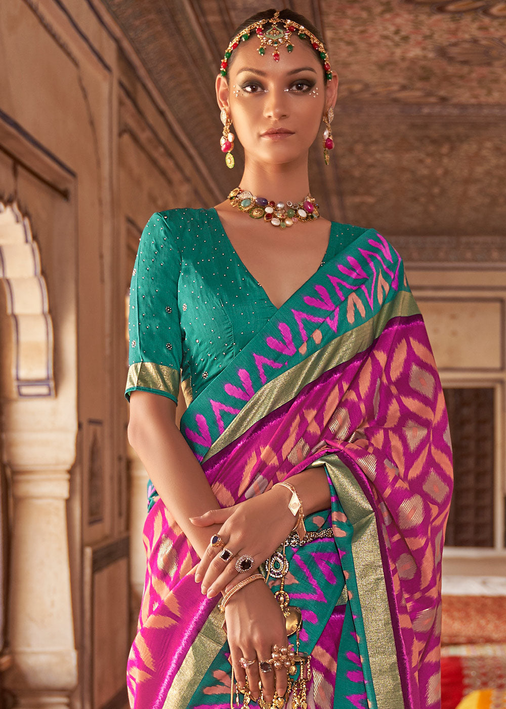 Pink & Blue Printed Patola Dola Silk Saree with Zari Border