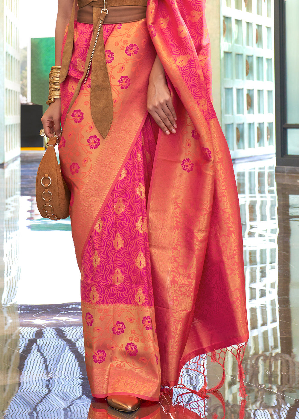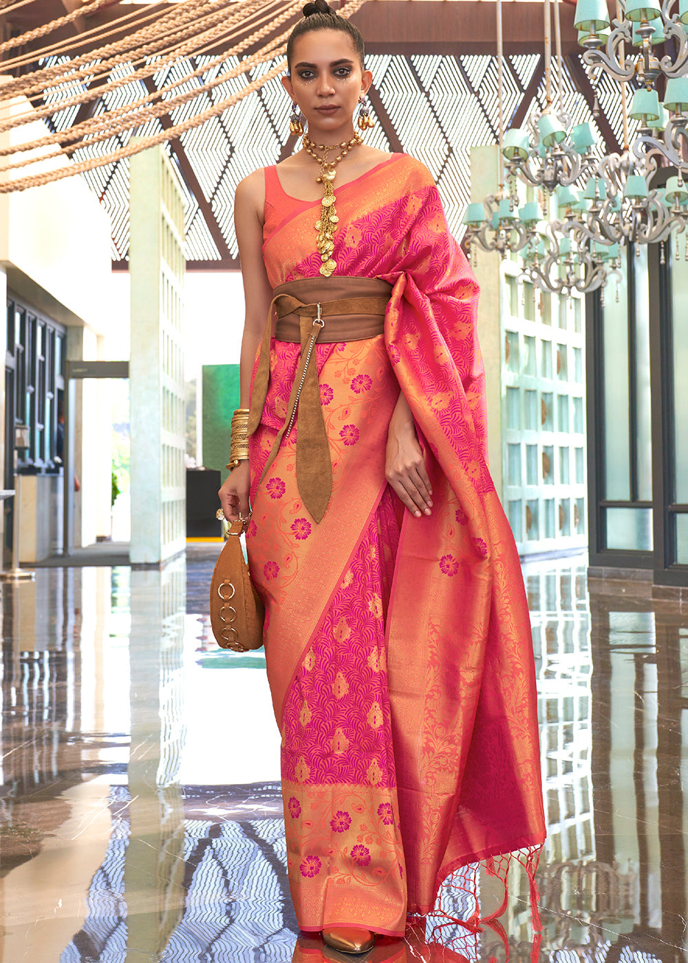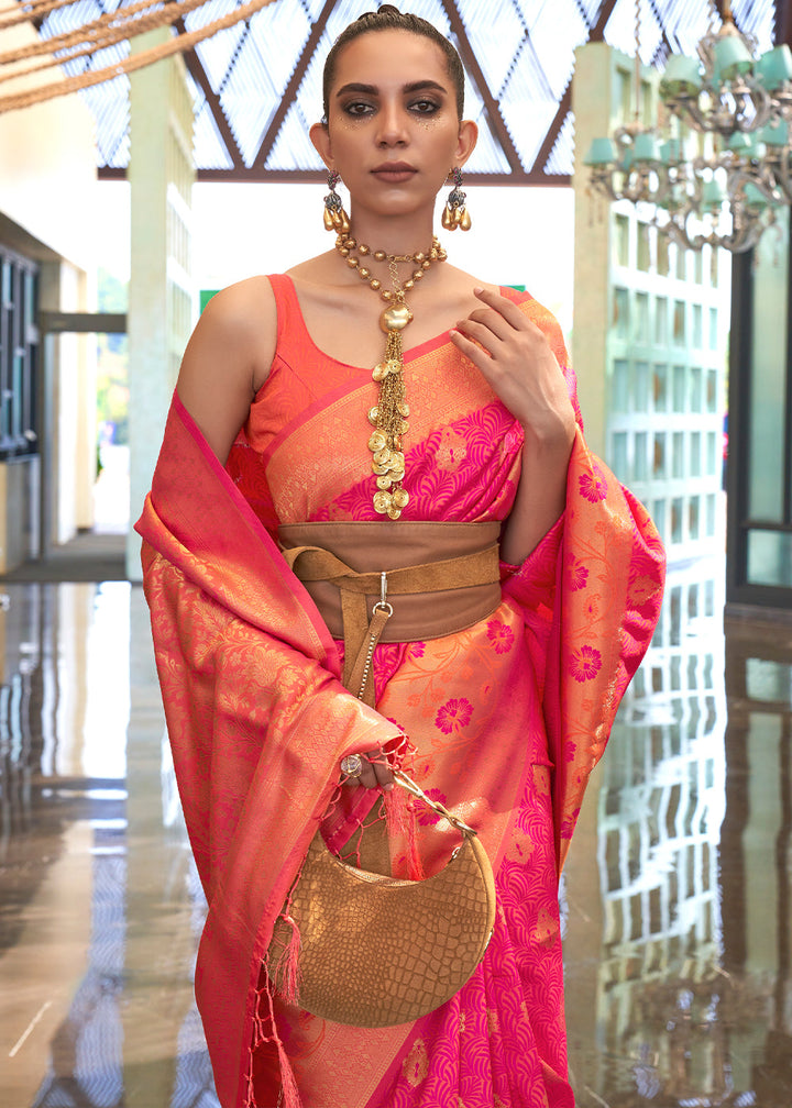 Pink & Orange Zari Woven Banarasi Silk Saree