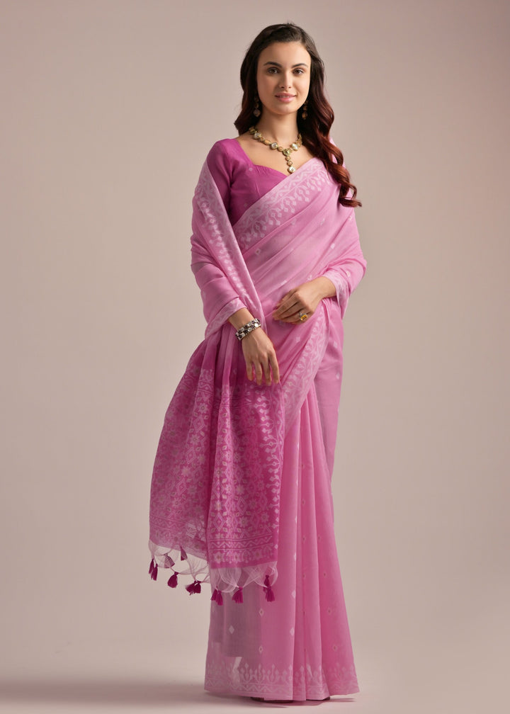 Step into a world of timeless elegance with this Pink Thread Butti Lakhnawi Weaves Muga Cotton Saree. Intricately handwoven, the saree showcases the delicate beauty of Lakhnawi weaving techniques with finely crafted thread butti (motifs) that add subtle charm and sophistication. Made from luxurious Muga cotton, it offers a rich texture and natural sheen, perfect for both festive occasions and graceful everyday wear.