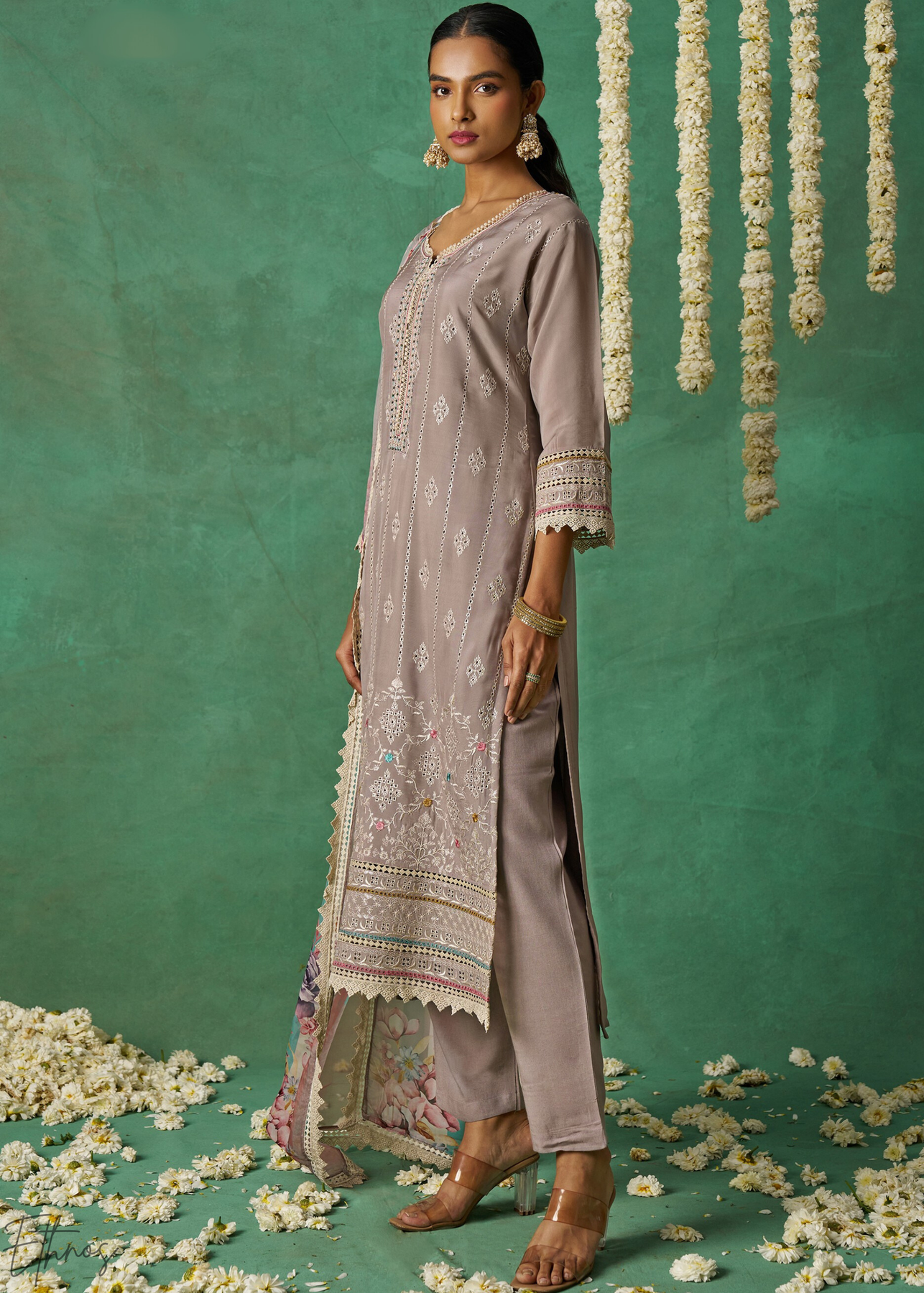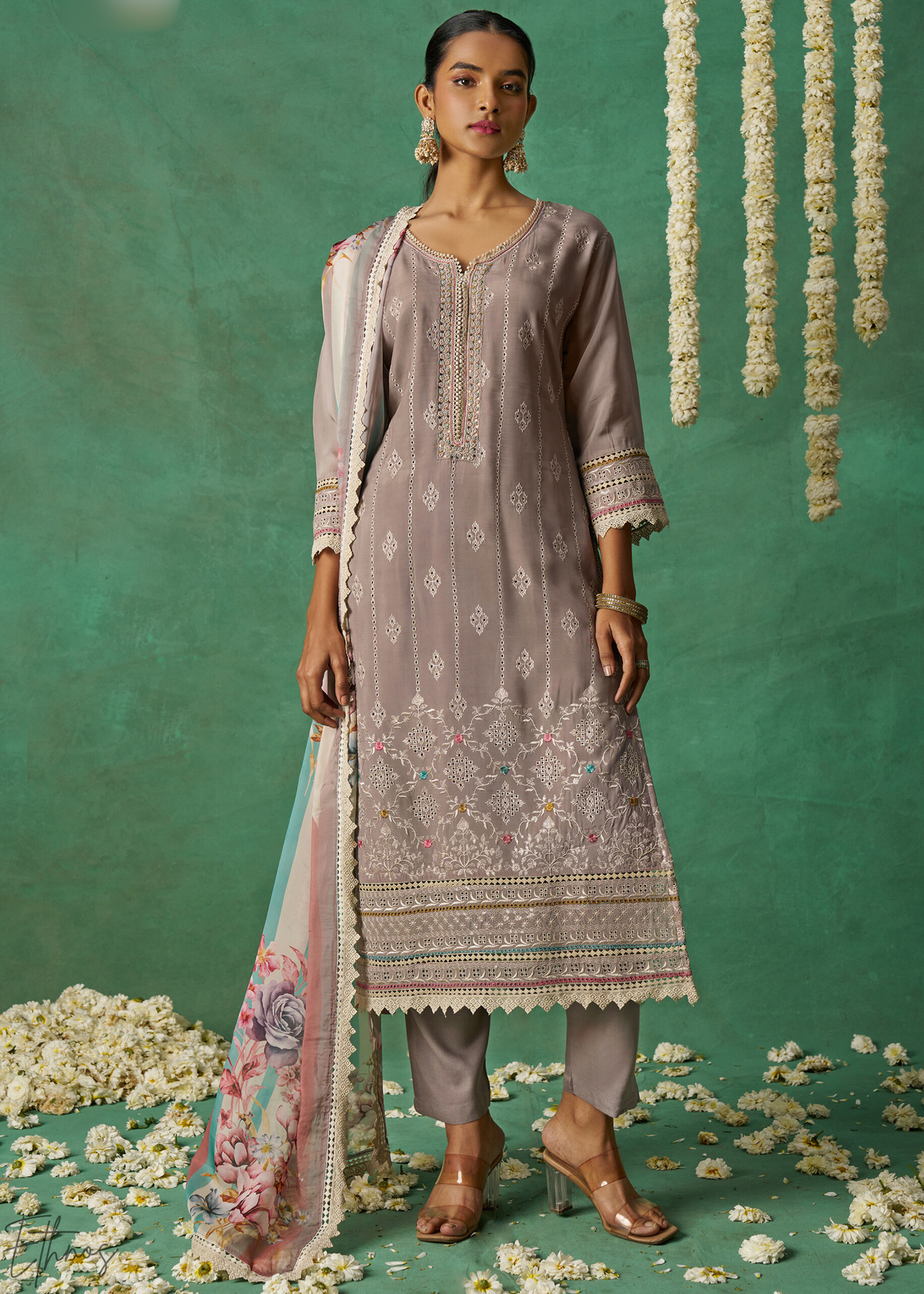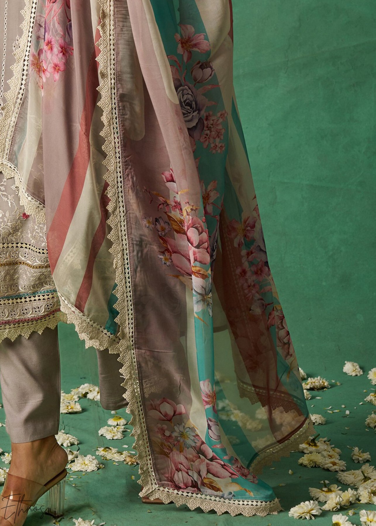 This sophisticated ensemble features a meticulously embroidered organza tunic paired with a warm peach-toned floral dupatta. The soft pastel accents of the dupatta perfectly complement the neutral base, creating a timeless look for garden weddings or high-end daytime events. It is a complete, ready-to-wear set designed for effortless elegance.