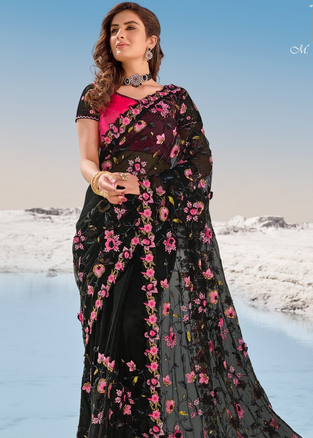 Pitch Black Designer Net Saree with Hand-Made Flower,Moti & Cut-Dana work: Top Pick