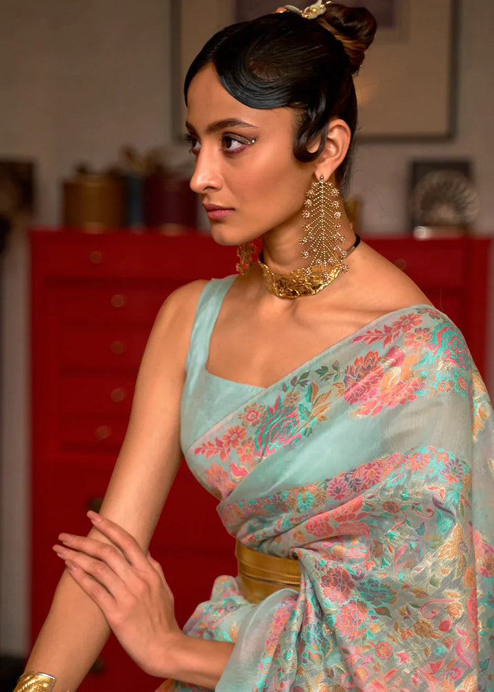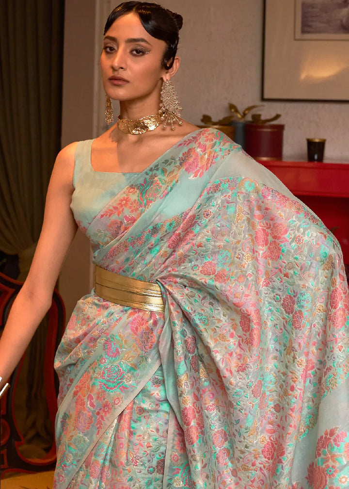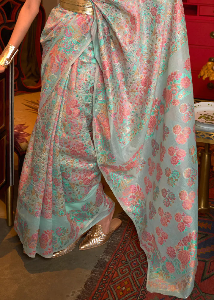 Powder Blue Kashmiri Handloom Weaving Silk Saree
